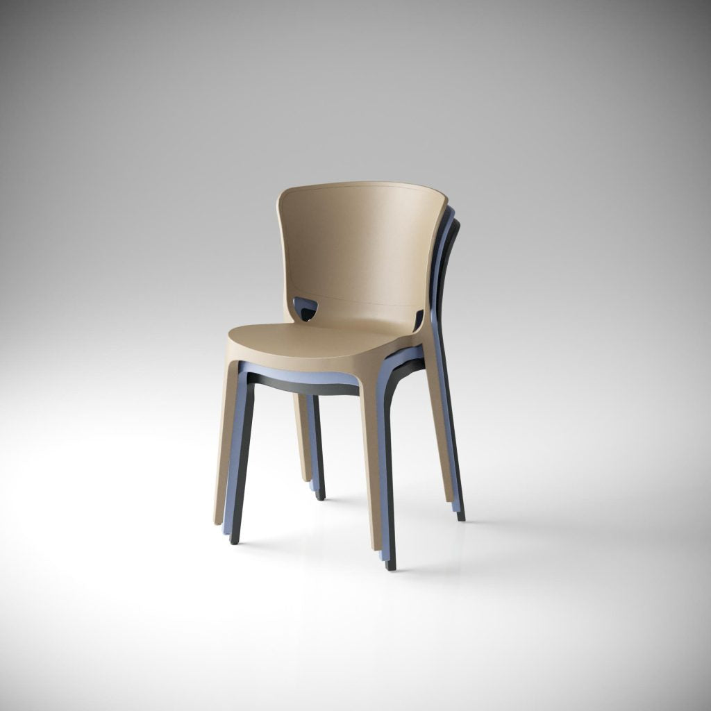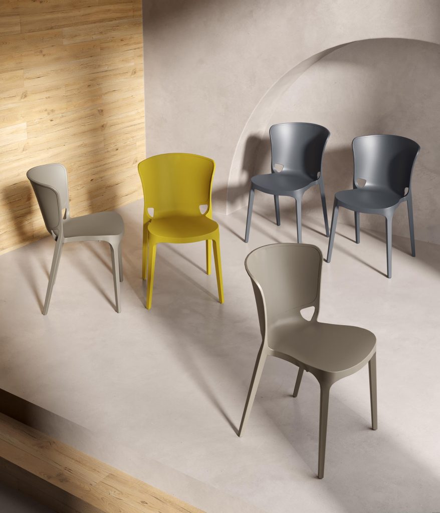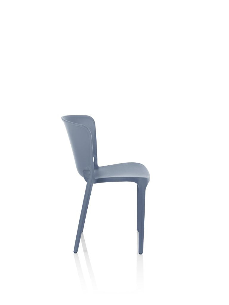 La sedia Aura è caratterizzata da curve morbide ed avvolgenti che le conferiscono un aspetto accogliente, giocoso e confortevole che invita a sedersi. La nitura opaca aggiunge un tocco morbido ed invitan- te. Può essere impilata no ad un massimo di 6 unità.