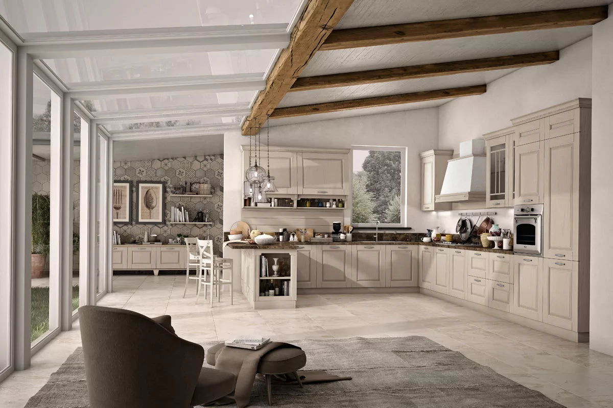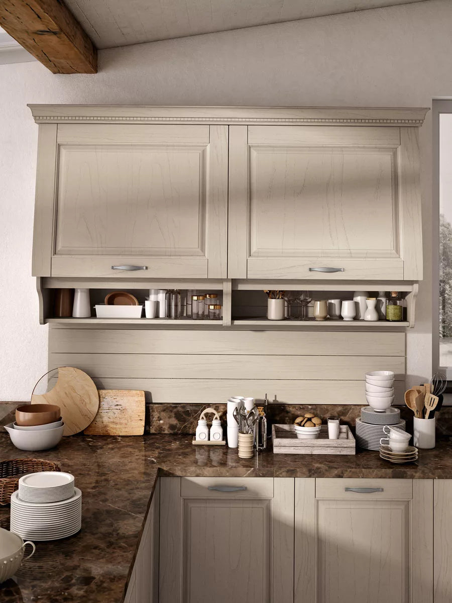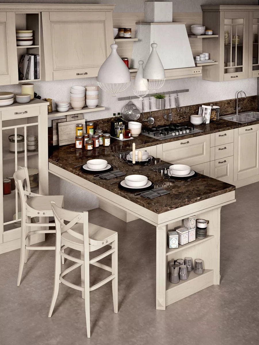 In Bilbao 03 il legno si veste di una connotazione classica, raccontando una storia tutta italiana che rende questa versione una cucina dallo stile tradizionale. Un cucina classica dove tutto si coordina alla perfezione, alla ricerca dell’equilibrio tra valore estetico e quello funzionale. Una composizione di grande effetto caratterizzata da una zona cottura con cappa a camino, pensili che si possono attrezzare con mensole e dalla penisola, pratico piano di lavoro che veste perfettamente anche i panni di una zona in cui fermarsi a leggere, mangiare o conversare. Una cucina dallo stile classico per chi ama il bello ma senza eccessi.