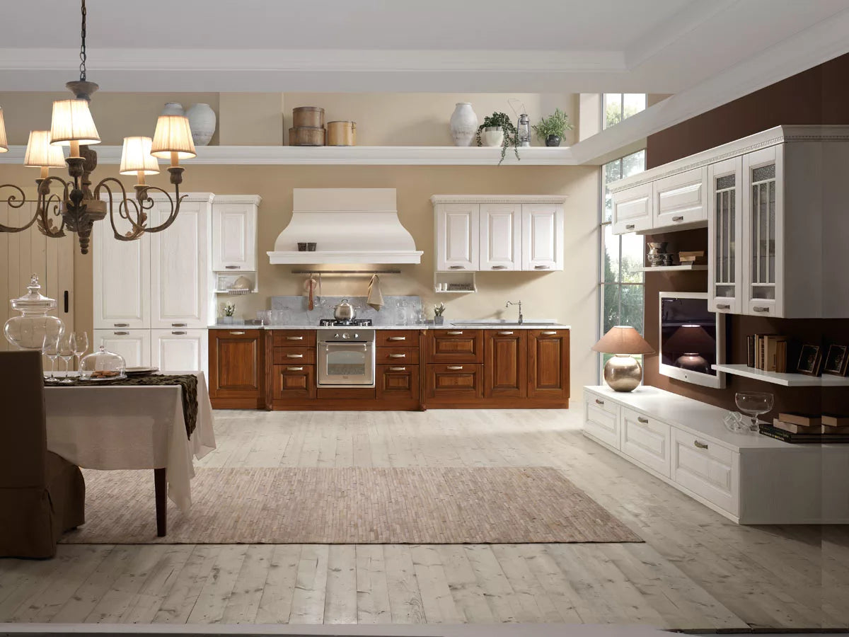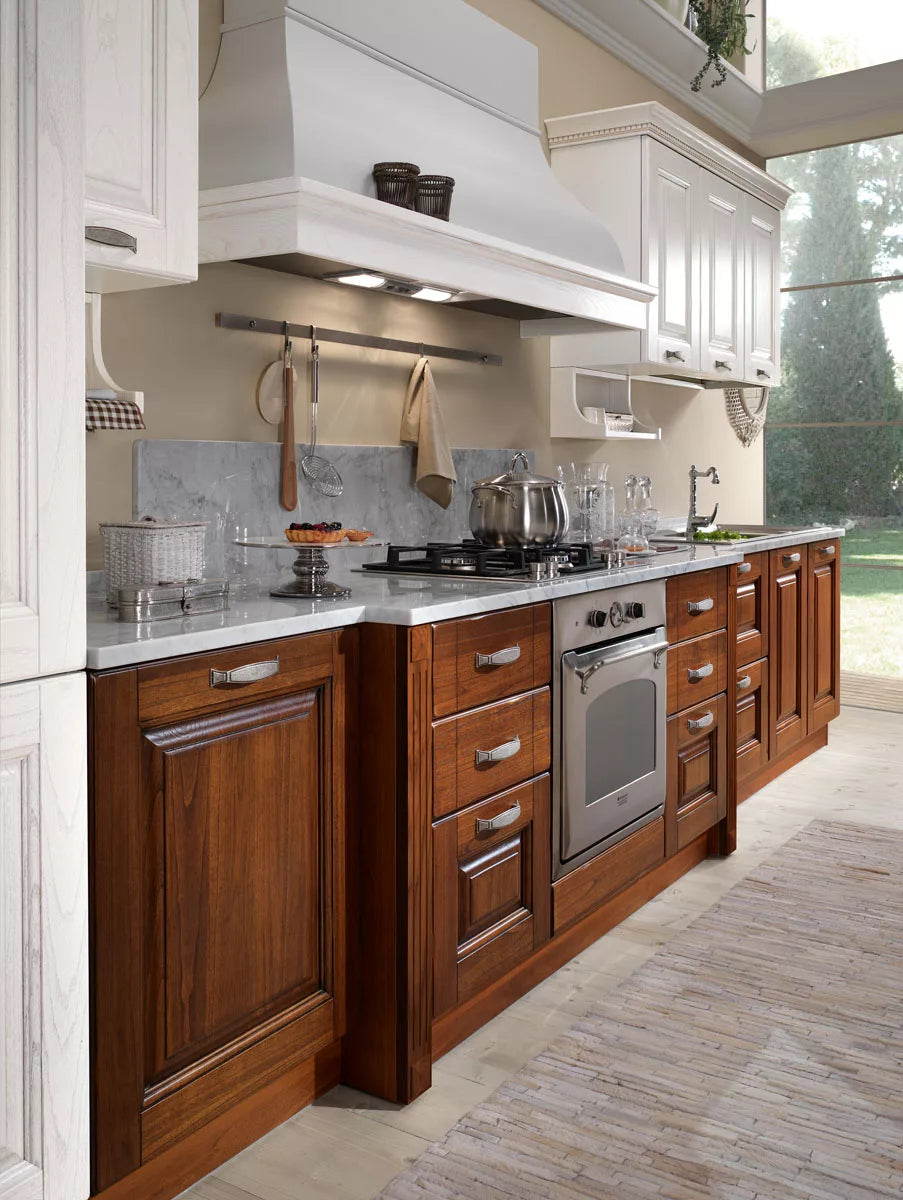 La cucina Bilbao 07, è la cucina classica componibile capace di realizzare un sogno, una casa, una famiglia: una storia sempre diversa, carica di ricordi e di tradizione. Bilbao ripropone il modello della cucina tradizionale che trae ispirazione dall’Ottocento italiano, declinandosi in un ambiente dove batte il cuore della famiglia. Un mood sottolineato anche dalla scelta del noce, che comunica un’immagine di solidità. Al centro di questa cucina c’è la grande cappa a camino, che non è solo un elemento operativo, ma si trasforma in un oggetto dal carattere espositivo. E tutt’intorno alla zona dedicata alla cottura, basi e pensili assolvono la funzione legata al contenimento. Una cucina senza tempo dal carattere unico!