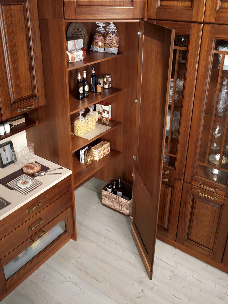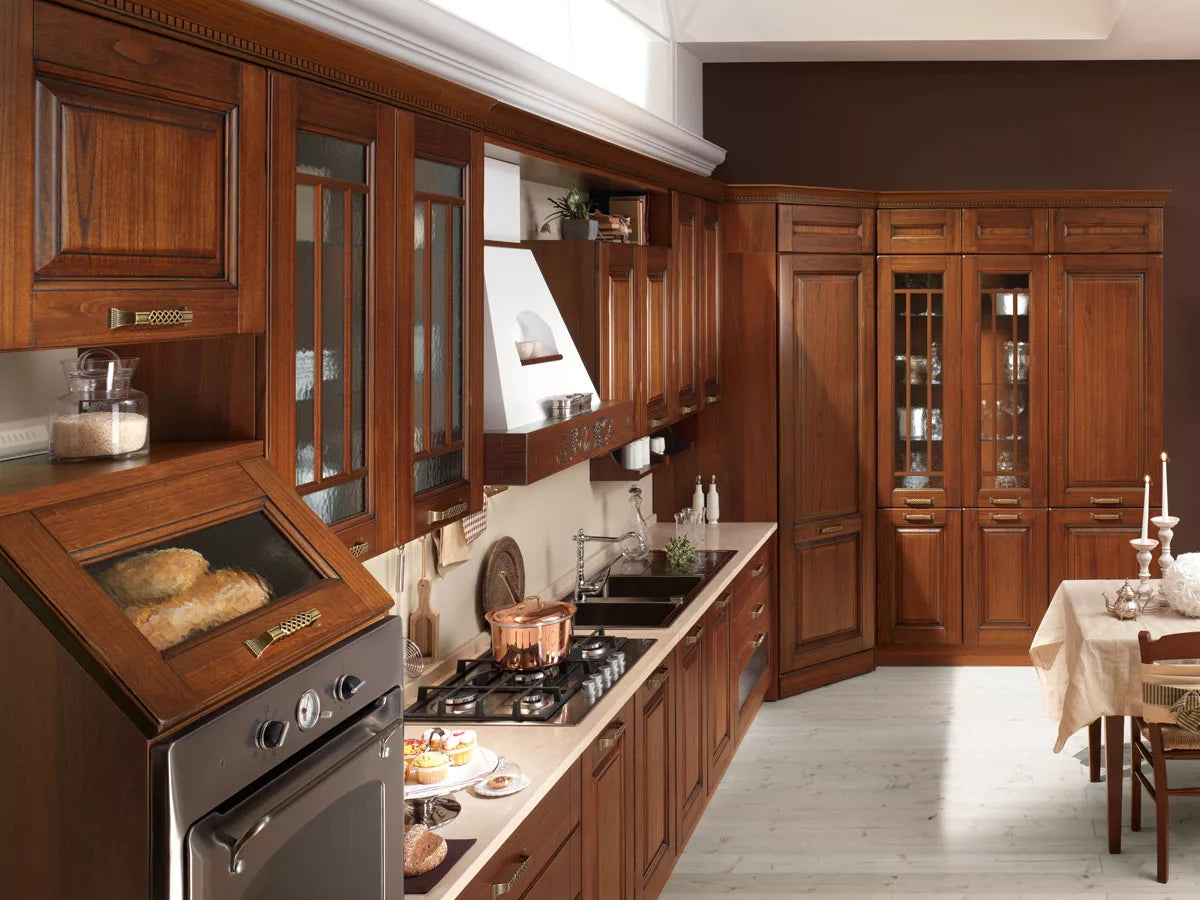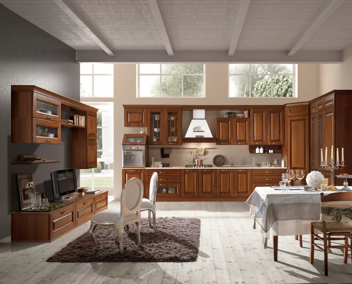 Tutto ruota intorno alla cucina, se la cucina è Bilbao 08: uno spazio conviviale da assaporare in totale libertà, un ambiente classico e confortevole che interagisce armonicamente con il living, formando in maniera naturalmente fluida un open space. Pensili con anta in legno o vetro modanato, sottopensili, basi, cappe e piani cottura sono alcuni degli elementi che si alternano flessibilmente, dando vita a molteplici soluzioni funzionali ed estetiche. Bilbao è pensata per chi dà valore economico ai propri acquisti, ma soprattutto per chi pensa che sia ancora importante fare le cose nel modo migliore. Una cucina dove la parola tradizionale non si riferisce solo a uno stile, ma a tutto ciò che riconduce a un passato rassicurante. Qui tutti gli elementi, dalla cappa al grande tavolo, dai contenitori ai dettagli come le maniglie in bronzo concorrono a conservare quella magia speciale della nobile villa di campagna.