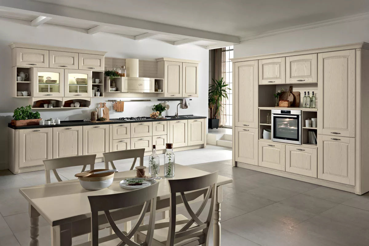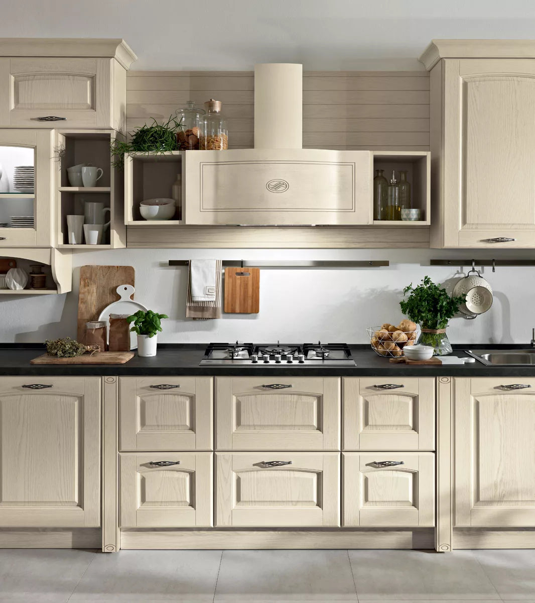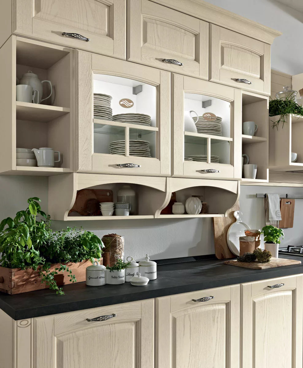 La Cucina classica Borgo 04 ci permette di poter scegliere un tono di colore o un particolare abbinamento di materiali non è quasi mai solo una scelta estetica. Spesso nasce dal piacere o dal bisogno di chiedere anche ad un arredo le sensazioni che fanno stare meglio le persone. C’è chi ha bisogno di una cucina con intorno pulizia e neutralità, ma anche chi vuole calore ed emozione. Ecco, quindi, un tono più caldo della finitura del legno, virata sul beige, che si accompagna con il top stone 545, un piano fortemente evocativo e piacevole da toccare e carezzare. Ad ognuno, risposte ai suoi desideri più intimi.