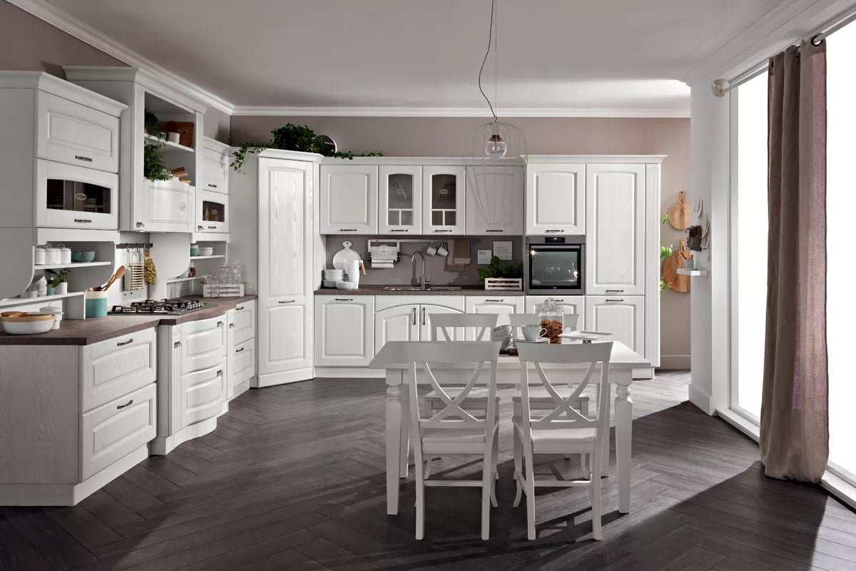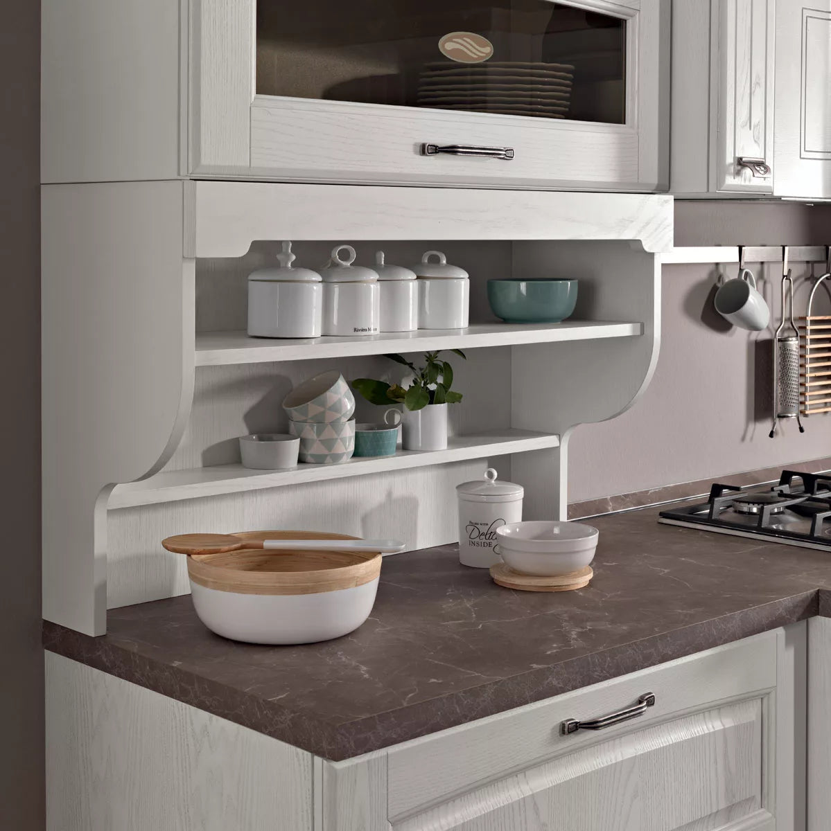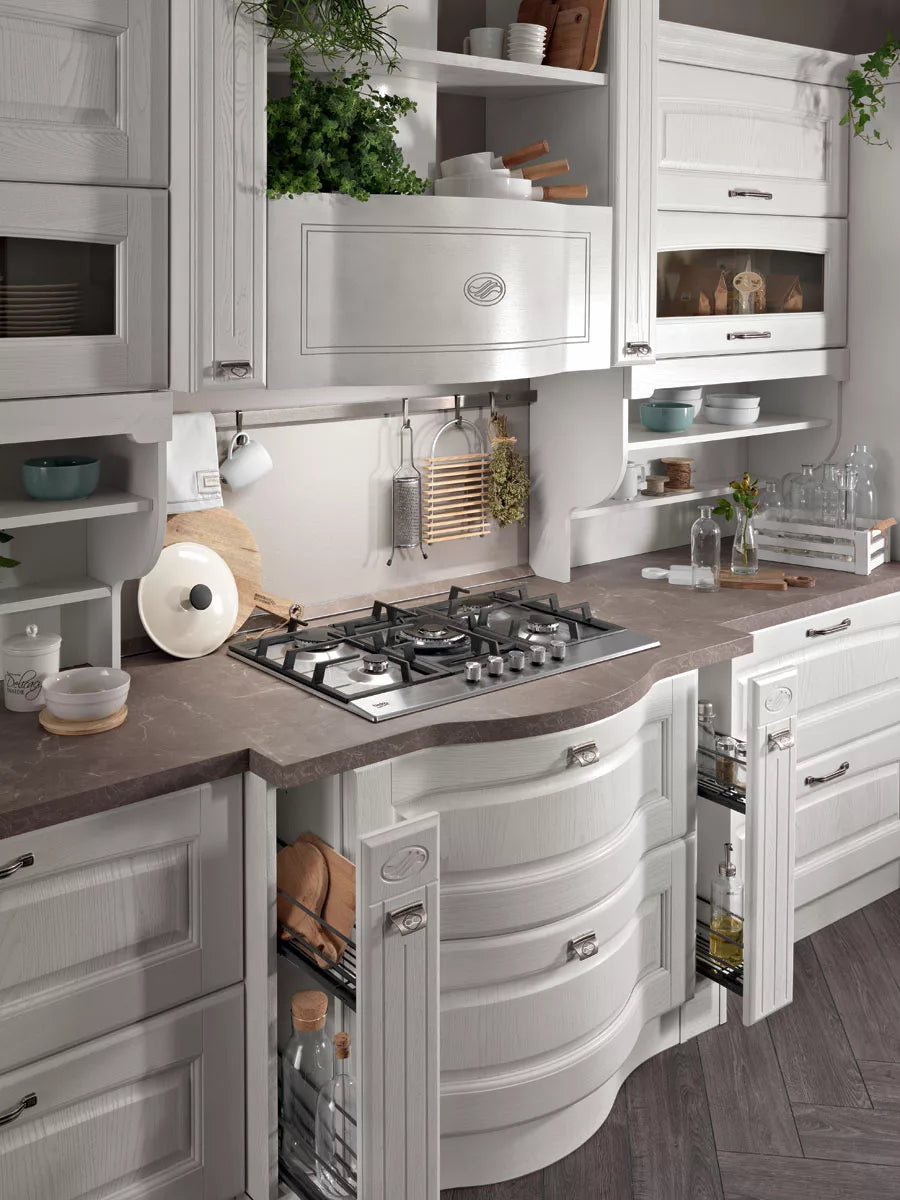 In cucina, soprattutto si lavora e ci si muove. Nella cucina classica Borgo 05 i rapporti tra le dimensioni e gli spazi, la disponibilità delle attrezzature, la successione dei ripiani, la visibilità dei contenitori sono fattori importanti, elementi che possono trasformare il lavoro in una piacevole esperienza. Se poi si può risparmiare tempo, evitare movimenti inutili e dispendiosi, fastidiose ricerche di questo o quell’accessorio, il lavoro diventa quasi un gioia. L’ergonomia è l’intelligenza della distribuzione spaziale.
