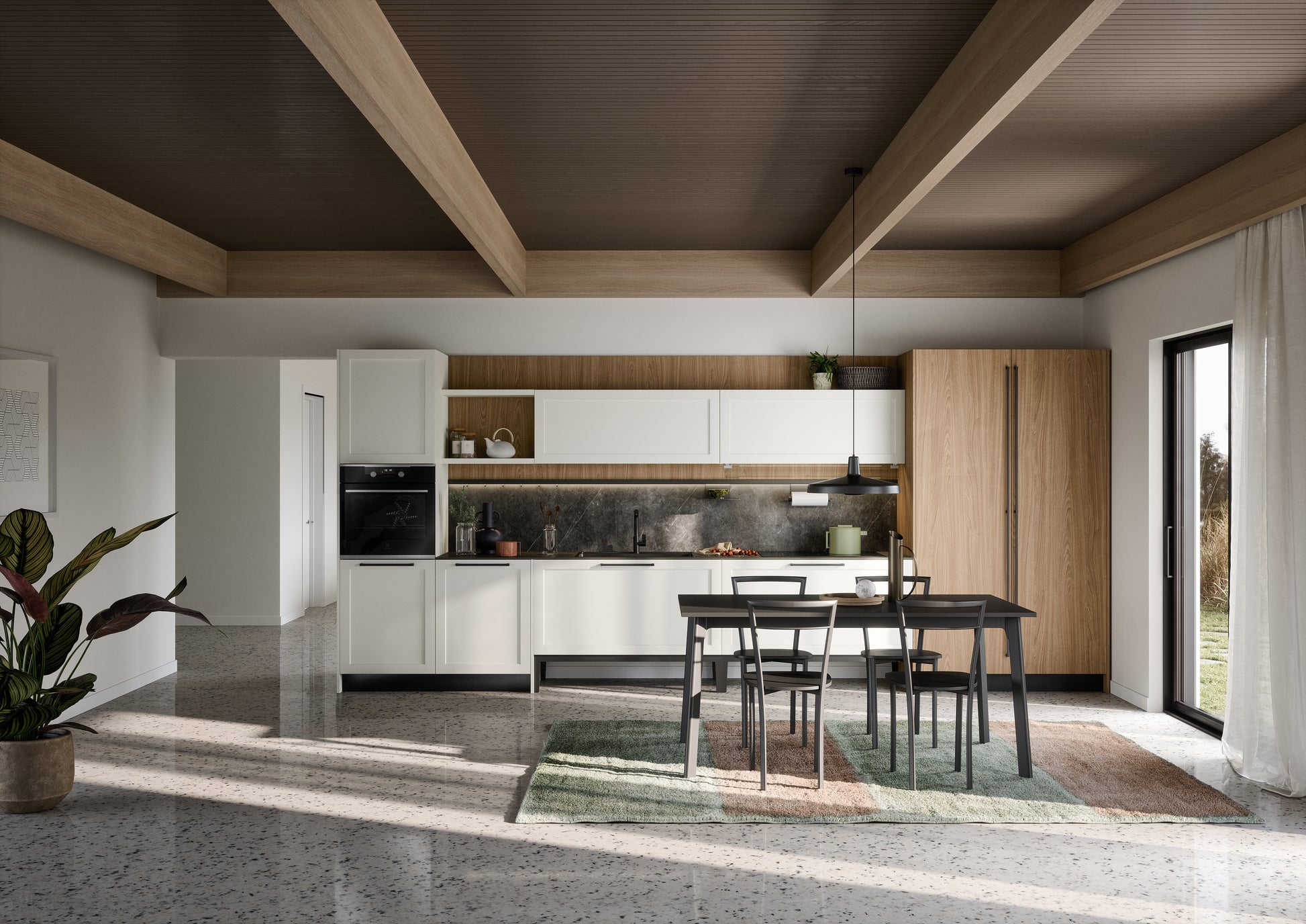 Soluzione semplice e conveniente per una cucina lineare e luminosa. Ante a telaio bianche in PET, tinta polo, abbinate al calore del laminato rovere anice di uno schienale e delle colonne con anta liscia, prese in prestito dal modello Domino. Un ultimo tocco contemporaneo, a contrasto, è dato dal piano di lavoro e dallo schienale in gres imperiale venato: simula alla perfezione il marmo, ma è molto più pratico da usare in cucina.