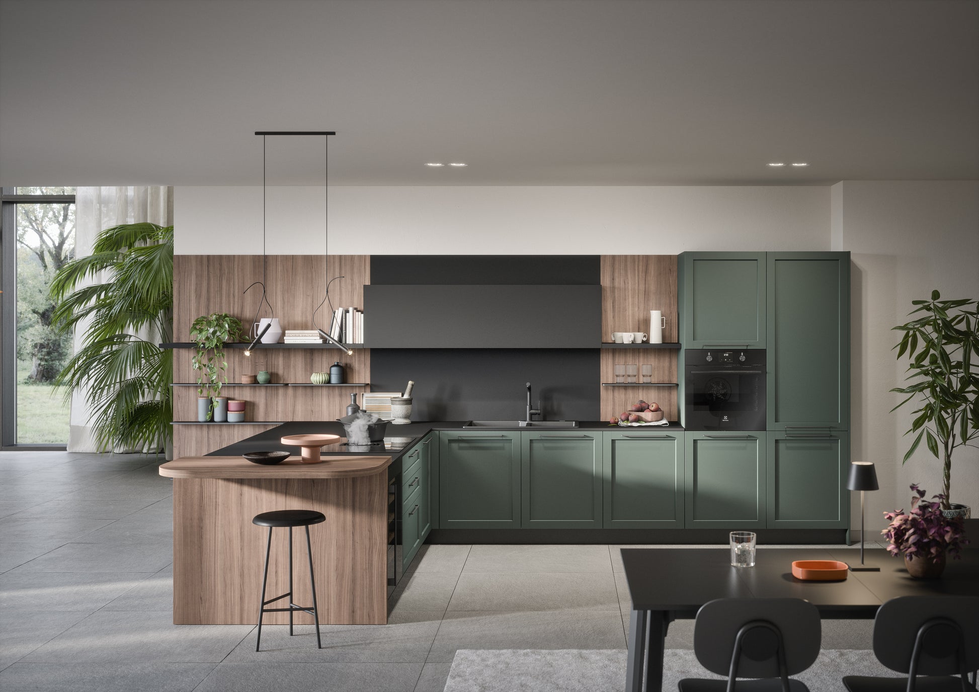 Desideri una cucina contemporanea e conveniente che sia, letteralmente, il centro di casa? Prendi spunto da Clio 06. È disposta su un’unica parete con ante a telaio in un’allegra tinta lauro. È completata da un’ampia penisola che si allunga verso la zona pranzo, mentre si affaccia con una fila di basi sul living e con l’altra sulla cucina vera e propria.