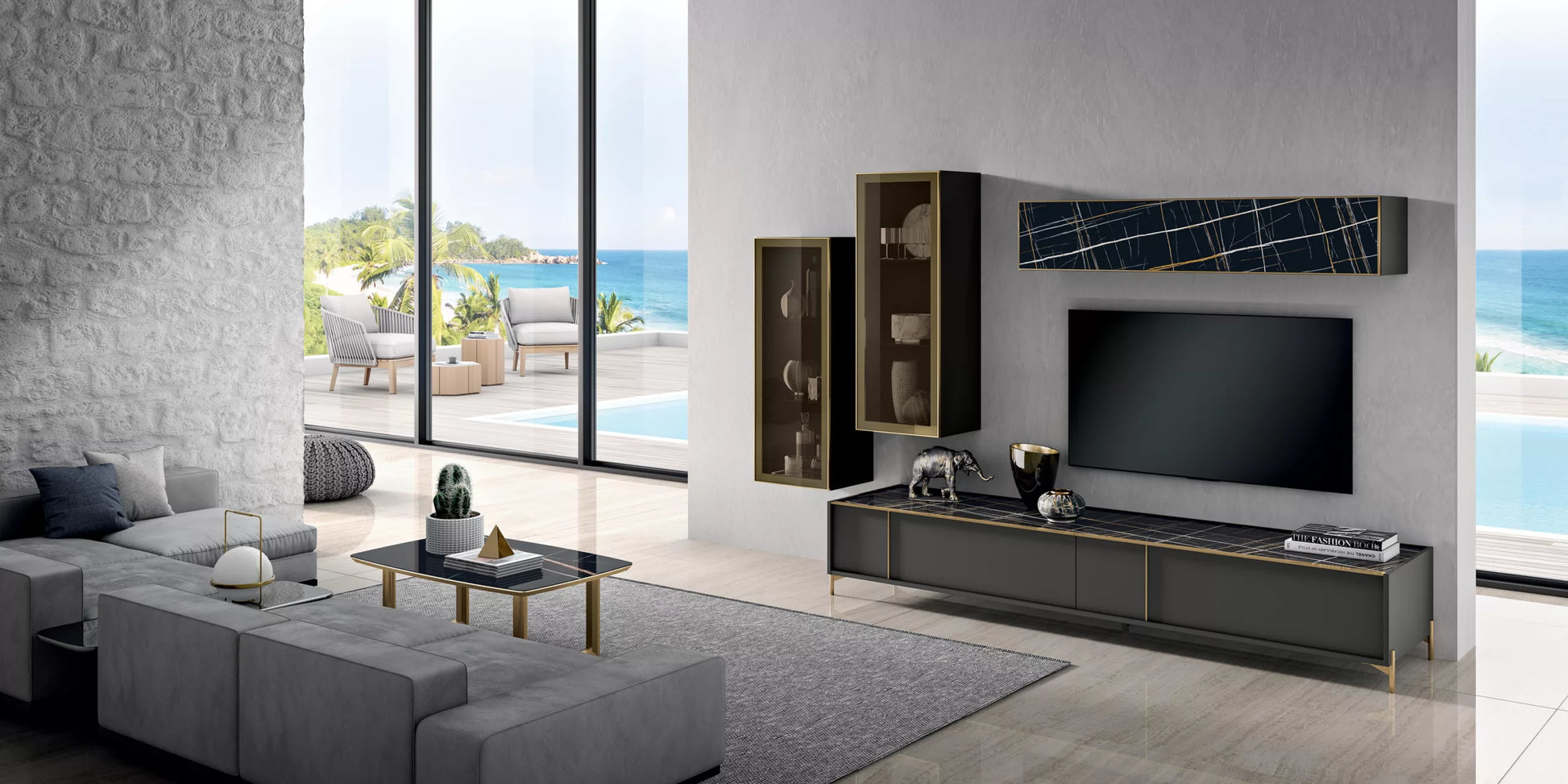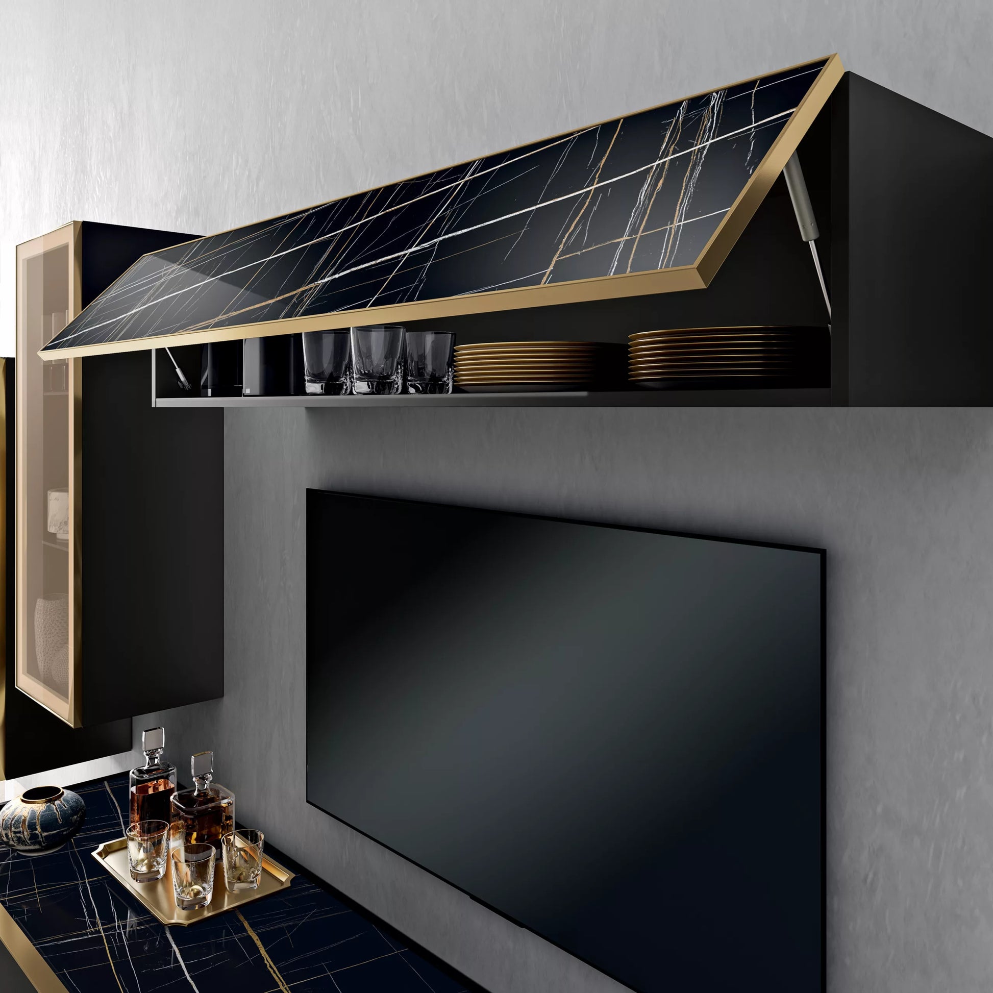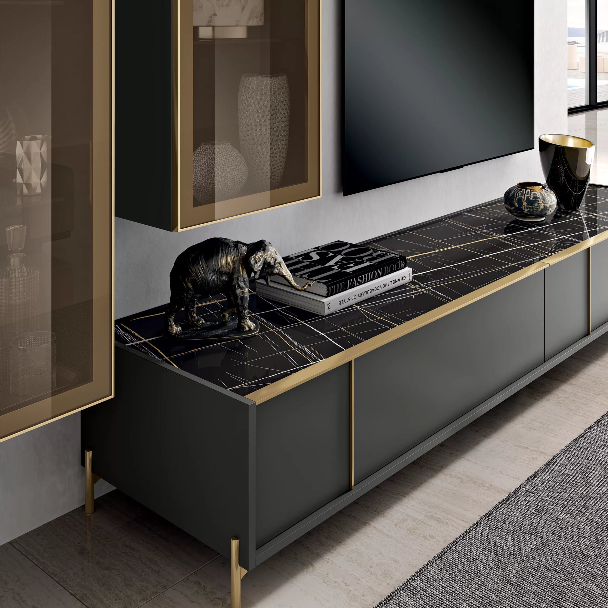 Proposta Lavagna – Vetri marmo Sahara Noir / Bronzo – OROTavolino SUITE Vetro marmo Sahara Noir – Bordo ORO – Gambe ORO