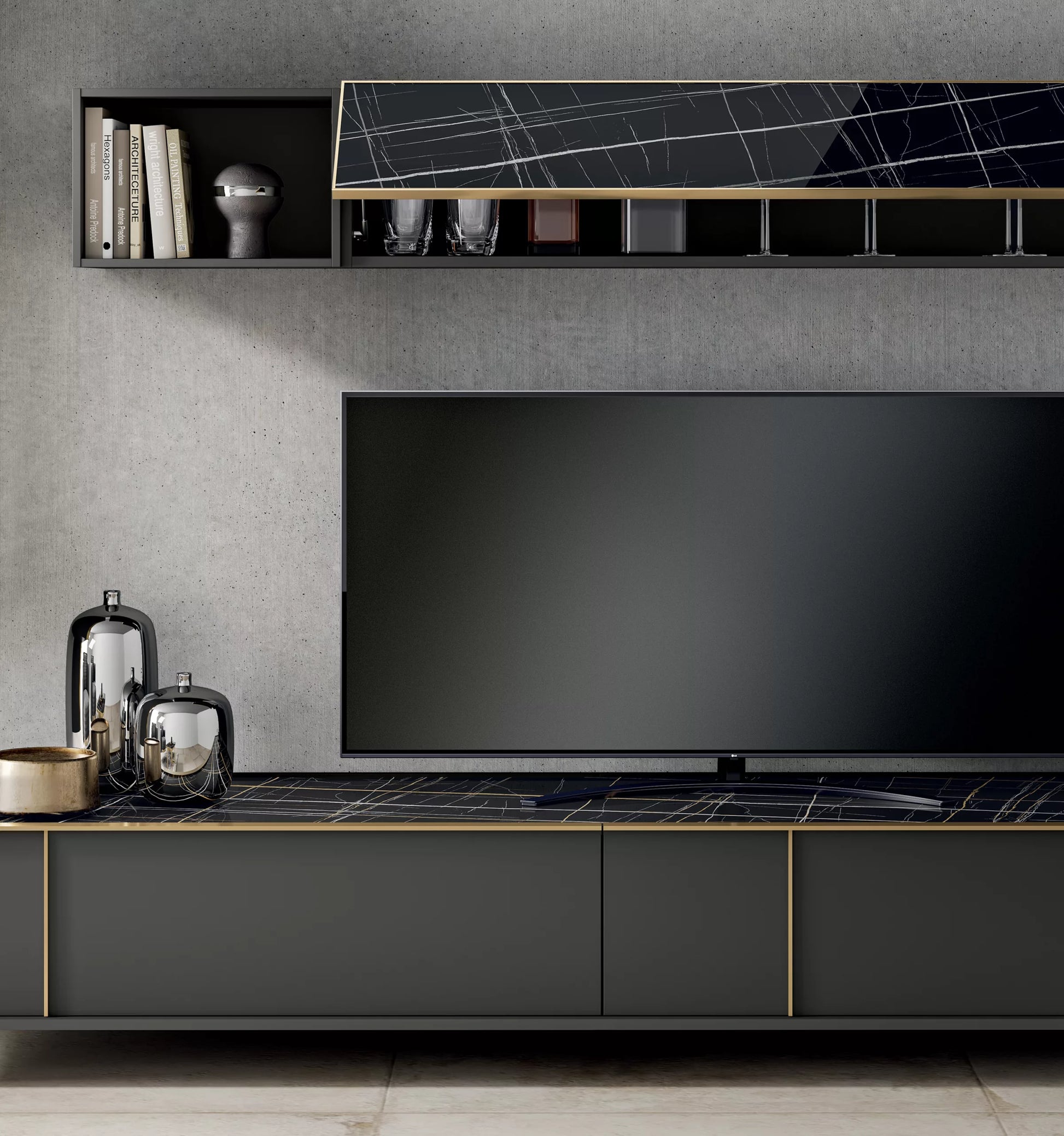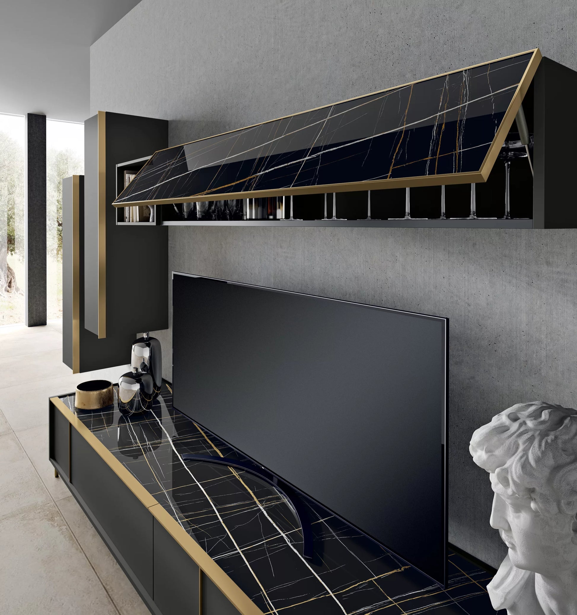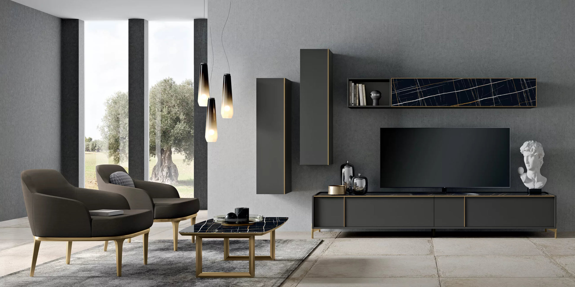 Proposta Lavagna – Vetro marmo Sahara Noir – OroTavolino SUITE Vetro marmo Sahara Noir – Bordo ORO – Gambe OroPoltrona MIA Microfibra velluto VIKY 34 – Base oro