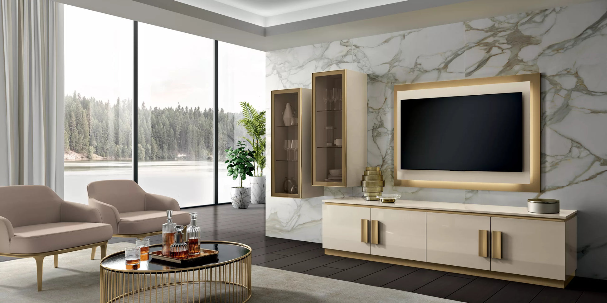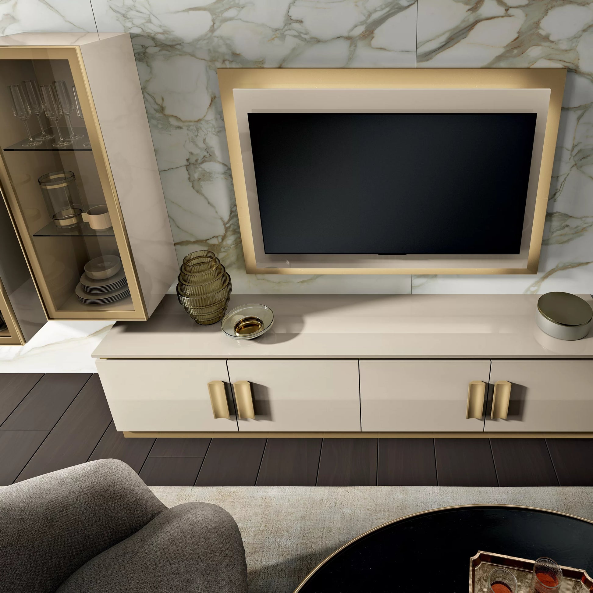 Proposta Sabbia lucido – Vetro stop sol – Oro – Porta tv con LEDPoltrona MIA Microfibra velluto VIKY 04 – Base Oro