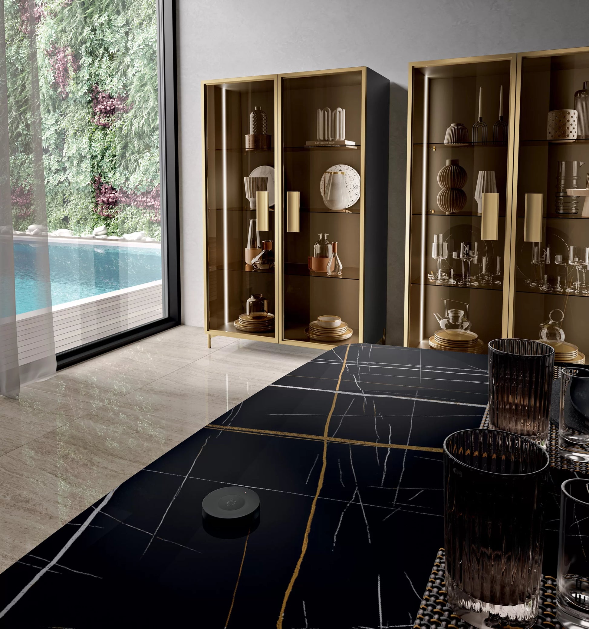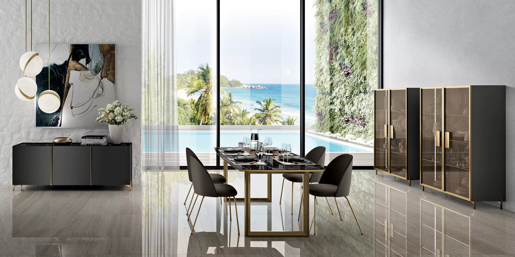 Tavolo SUITE Vetro Marmo Sahara Noir – Bordo Oro – Gambe Oro