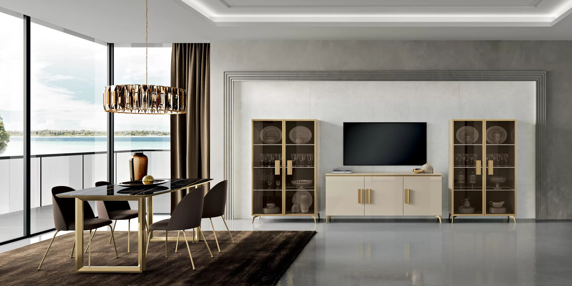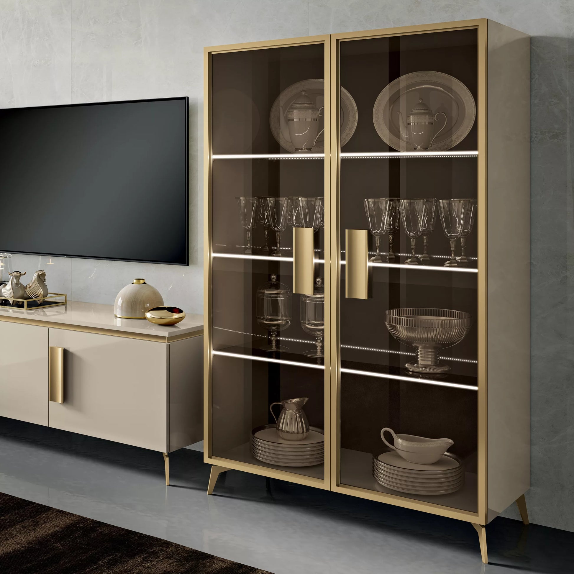 Vetrina SUITE Sabbia Lucido – Telaio anta, piedi e maniglie Oro – Vetro Bronzo – Profili con luce LED sui ripiani