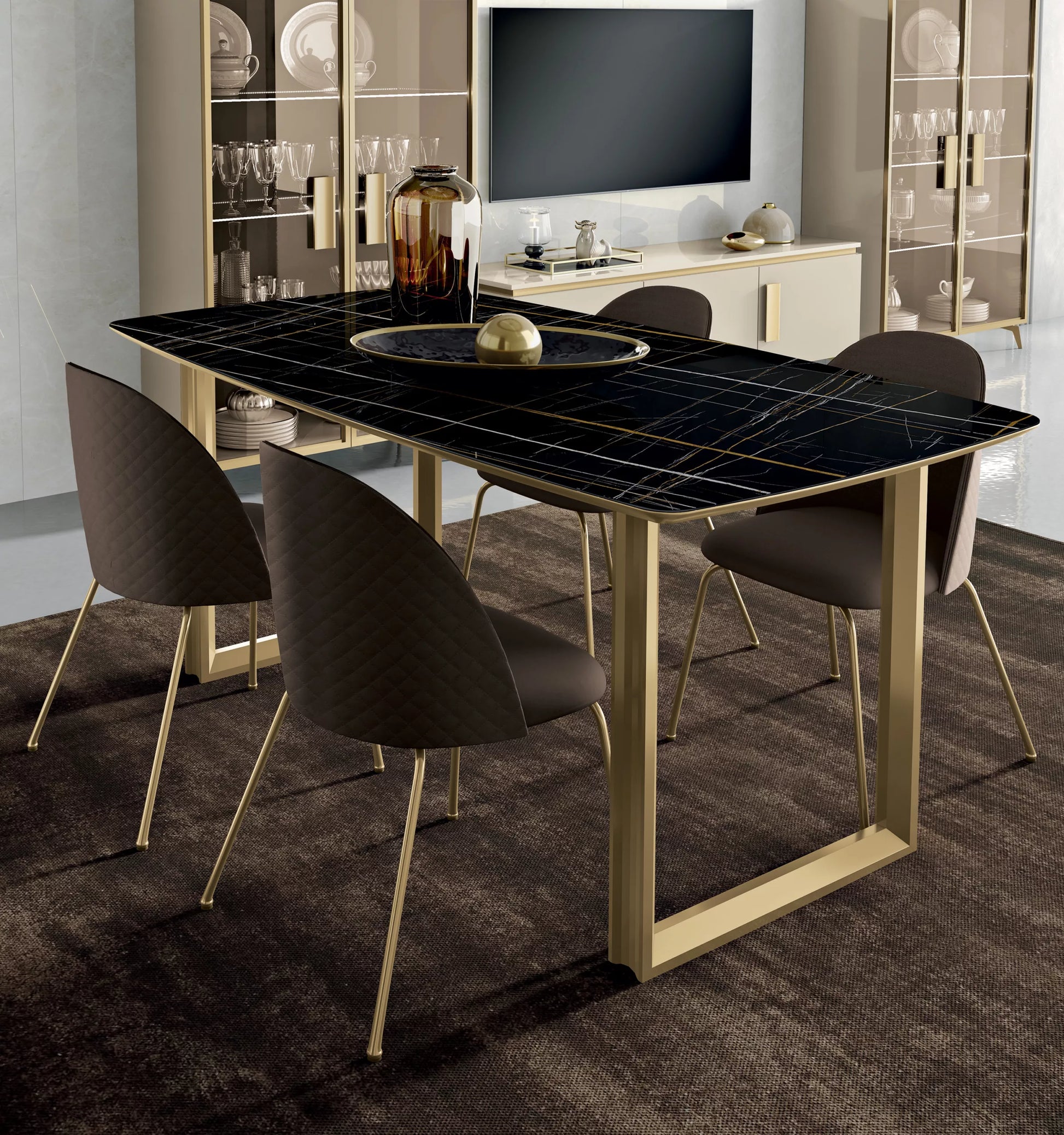 Tavolo SUITE Vetro marmo Sahara Noir – Bordo Oro – Gambe Oro