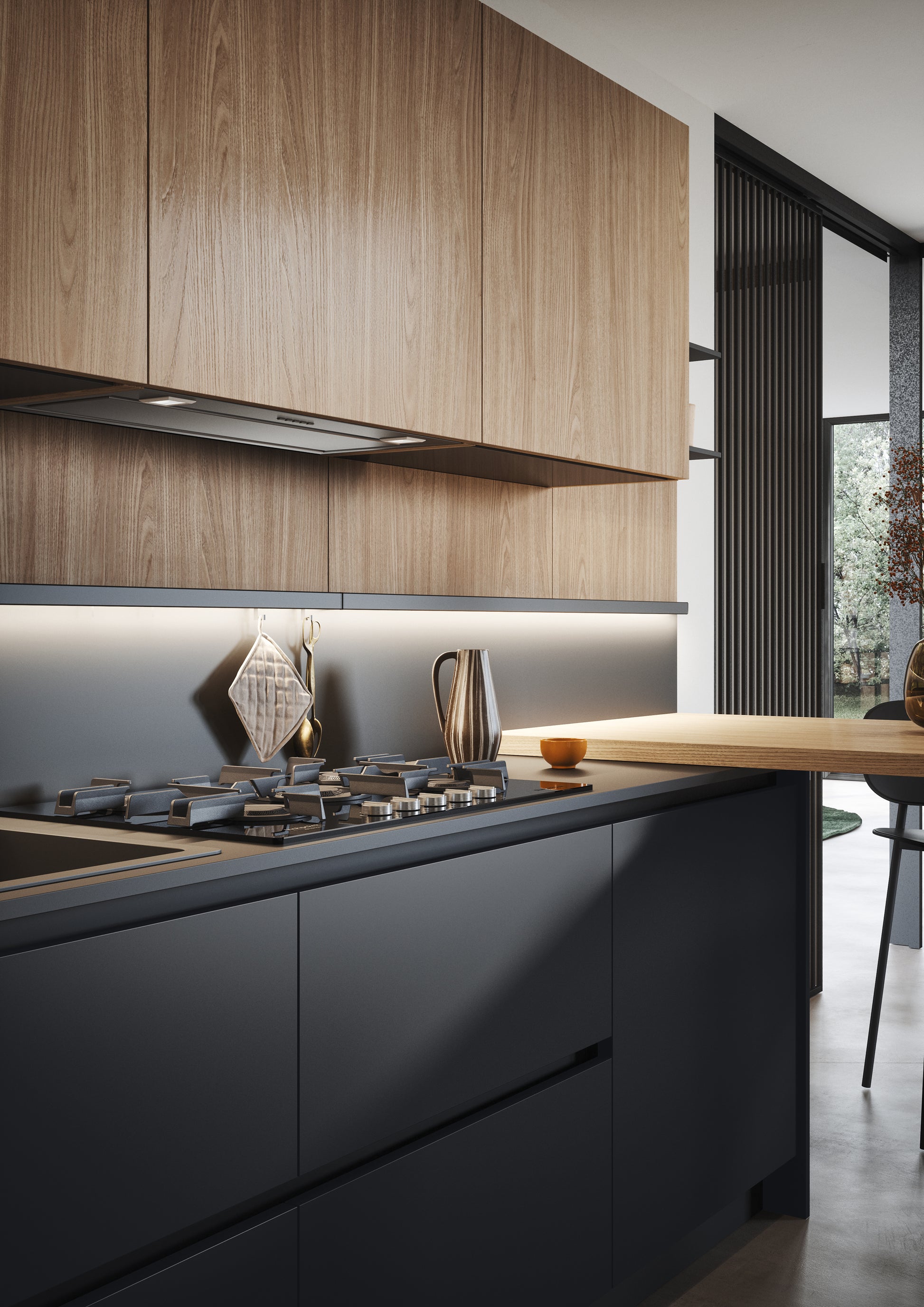 Tutto insieme, ampio piano snack vivibile compreso. È la cucina angolare Domino 08 con basi e colonne in PET liquirizia, una materia plastica dalla mano liscia, di facile manutenzione e resistente a graffi e macchie. Il loro mood dark è accentuato dal piano di lavoro, con schienale abbinato, in laminato Fenix® nero Ingo, che all’igienicità e alla praticità del laminato unisce un ultimo strato soft touch, molto opaco e resistente, lavorato con l’impiego di nanotecnologie.