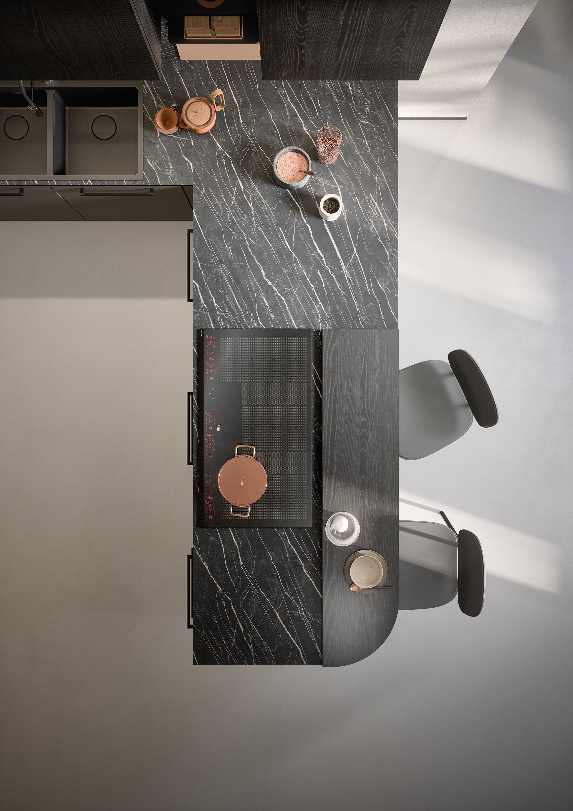 La cucina a penisola è corredata da un piano snack del programma Vario, con spigoli ampiamente arrotondati e superficie soft touch grazie all’ultimo strato in Fenix® del laminato usato. L’insieme è semplice e moderno, illuminato dal gres nero dorato dei piani di lavoro e dello schienale e dalla boiserie Ritmo. Questa, alle mensole dagli angoli arrotondati in HPL Fenix® nero Ingo, abbina un pannello che si fa notare per l’originale tono terra rosa.