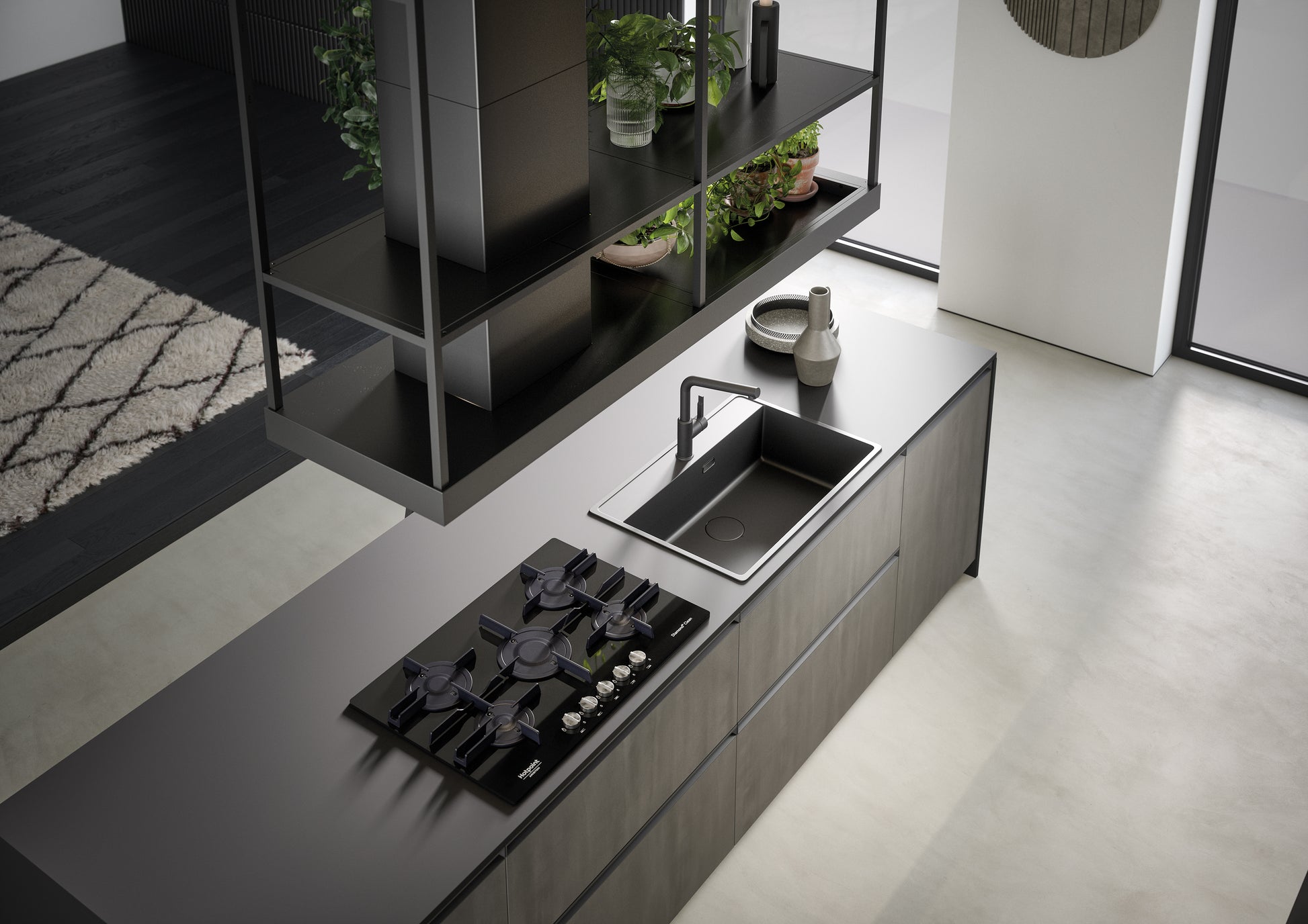 Design minimal e colori scuri per la cucina aperta sul living. La composizione ruota intorno all’isola operativa dove trovano sistemazione le postazioni per il lavaggio e la cottura e il lungo piano snack che nasconde due boiserie Ritmo, posizionate sotto al top, con schienale in laminato nero e mensole in HPL Fenix® nero Ingo. Quest’ultima finitura, ma in laminato, è ripresa per il top dell’isola, abbinato a basi in laminato metallo luna.