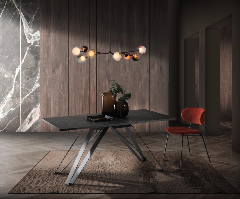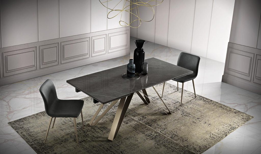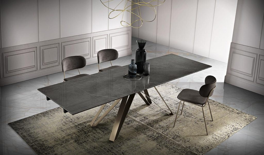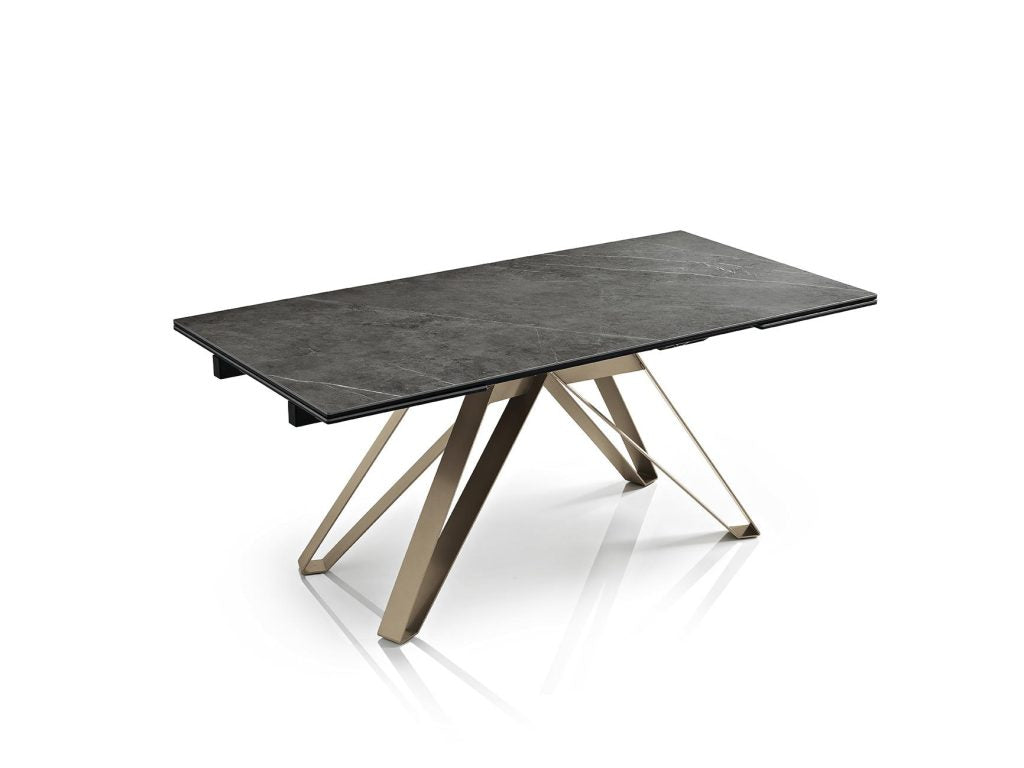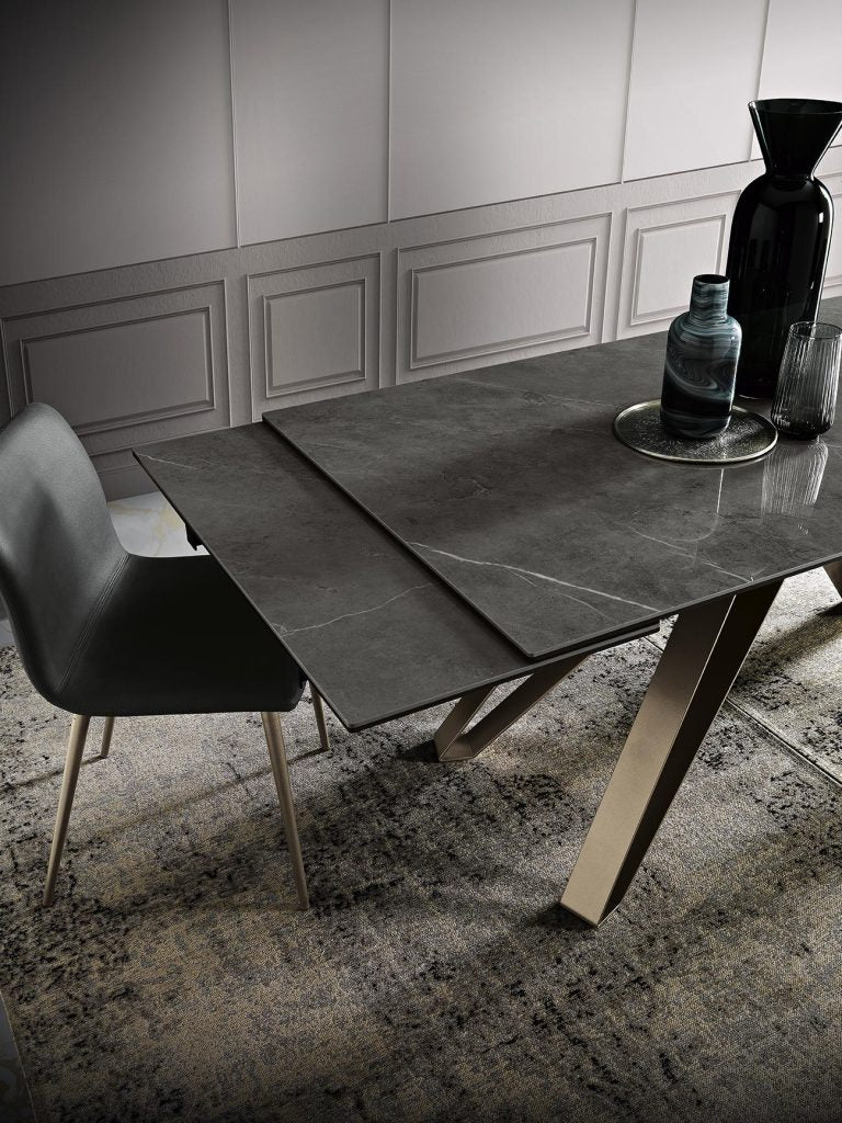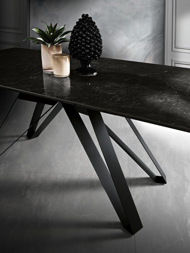 L’aspetto stellare costituito da quattro elementi in metallo, caratterizza il tavolo Kronos e ne garantisce stabilità. Il piano rettangolare è disponibile in diversi tipi di finiture in abbinamento ai colori della base, a scelta tra nero opaco, pearl gold e pearl beige. Kronos è disponibile in versione fissa ed allungabile in 5 dimensioni.