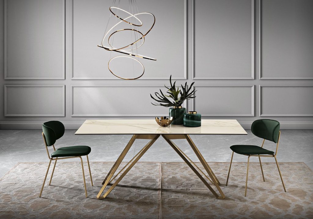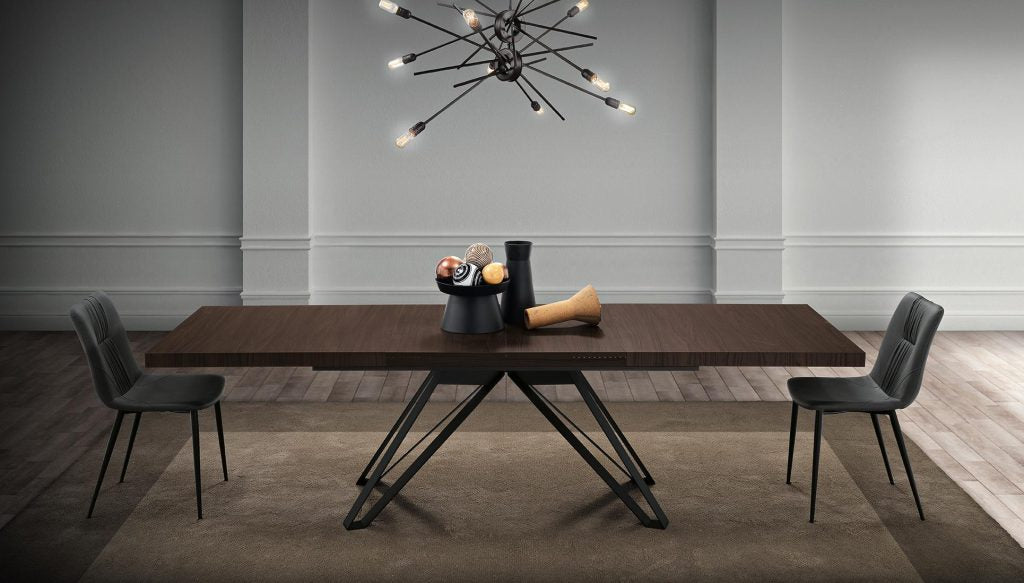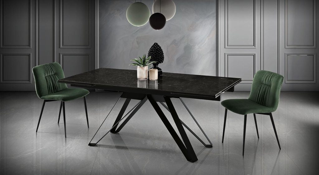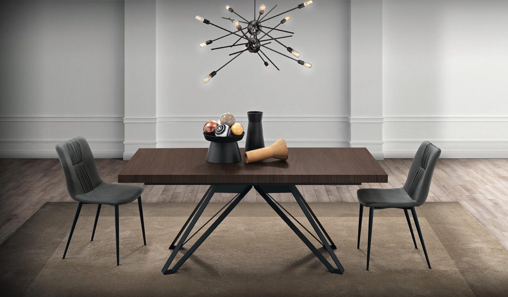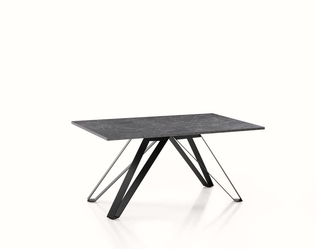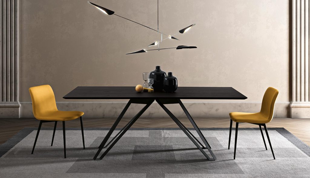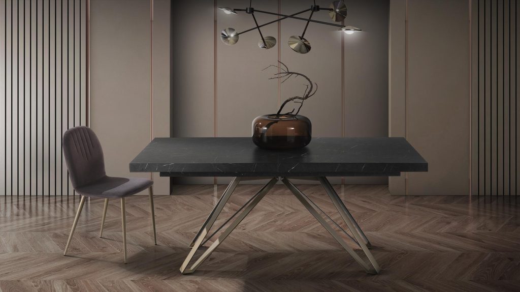 L’aspetto stellare costituito da quattro elementi in metallo, caratterizza il tavolo Kronos e ne garantisce stabilità. Il piano rettangolare è disponibile in diversi tipi di finiture in abbinamento ai colori della base, a scelta tra nero opaco, pearl gold e pearl beige. Kronos è disponibile in versione fissa ed allungabile in 5 dimensioni.