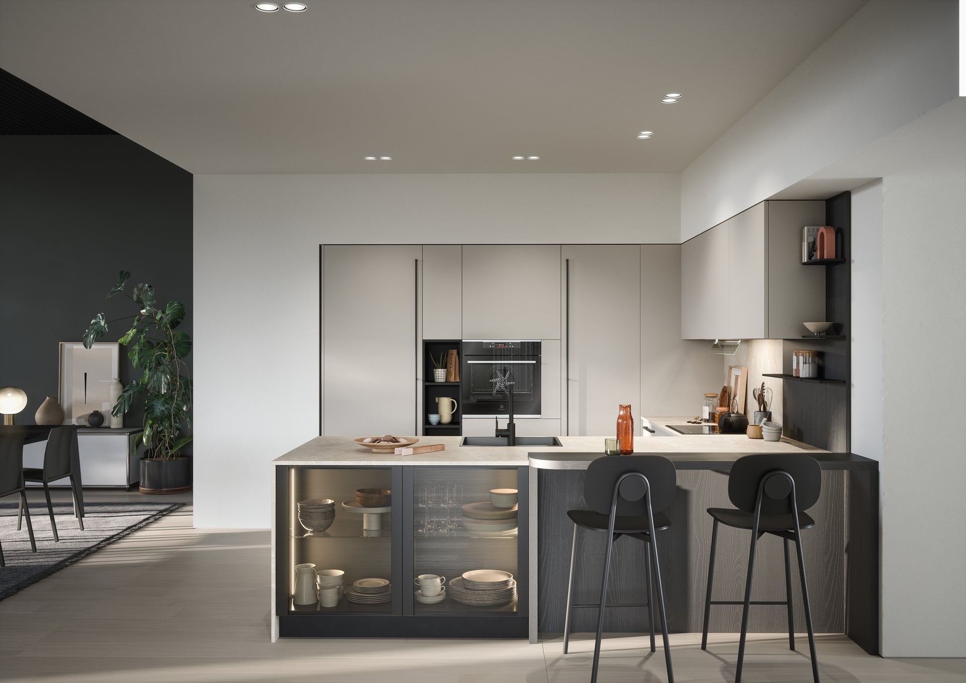 Una cucina a golfo caratterizzata dai toni chiari del laccato opaco amaretto di basi, colonne e pensili e dal laminato silvermine dei piani di lavoro e dello schienale. Tocco finale, i dettagli scuri che creano un contrasto netto: zoccoli e maniglie, boiserie Ritmo, elemento a giorno che movimenta le colonne, piano snack Vario, forno incassato e vetrinetta Unica sotto l’isola.