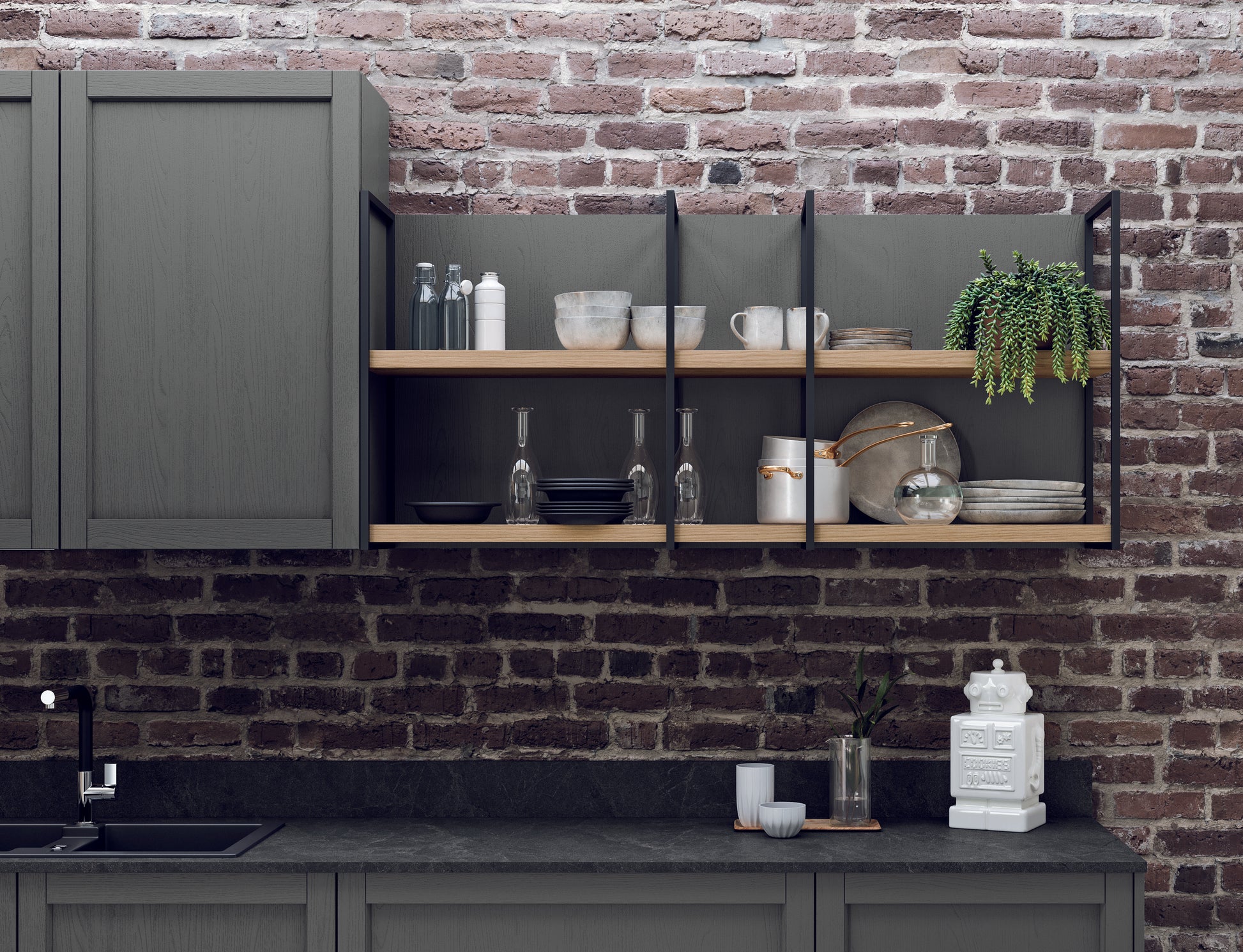 Perfetto stile industrial per la cucina ad angolo con isola Noah. Fra mattoni e putrelle, l'isola e le basi a muro sono poste “a binario”, scelta pratica purché ci siano almeno 120 cm fra i mobili di fronte per poter passare e aprire le ante. Dalle ante sopra e sotto il forno accedi ai vani del blocco ad angolo, organizzati con luci e meccanismi interni a estrazione.