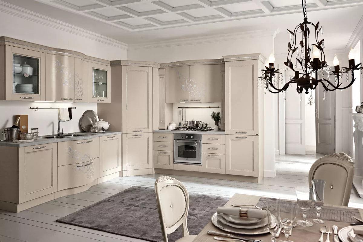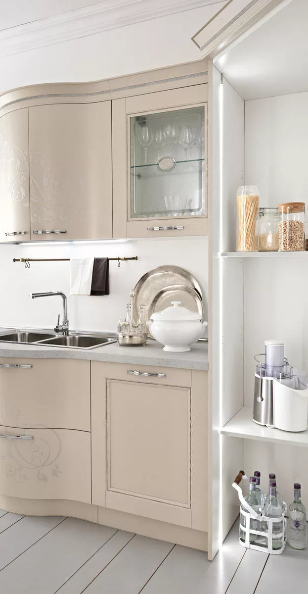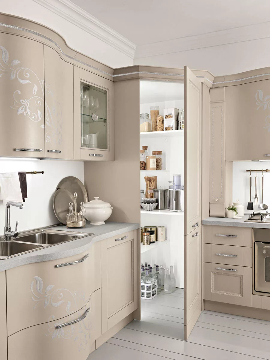 Prestige 32, la versione luxury e glamour della collezione. Sdrammatizza la ricchezza con piccoli dettagli di apparente semplicità. Massima libertà compositiva per una cucina fatta su misura per ogni esigenza e gusto. Questa versione del modello, una cucina ad angolo raffinata ed elegante, con ampio spazio di lavoro e comoda dispensa centrale ad angolo per riporre alimenti e utensili. Anche questa versione non delude le aspettative.