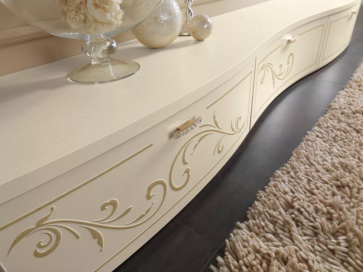 Liberty 101 è l’arredamento per il soggiorno classico e romantico, per un gusto sobrio e ricercato. Forme curve impreziosito da decori floreali e maniglie personalizzate. La composizione in avorio con una capiente base a terra frontali ricurvi dona classicità e raffinatezza all’ambiente. I pensili verticali a colonna accostati a pensili a vetrina danno un tocco di originalità e di tendenza. Elementi con ante sinuose arricchite da decori floreali e maniglie a forma di foglia argento: complementi eleganti e funzionali che richiamano lo stile classico che caratterizza questa linea.