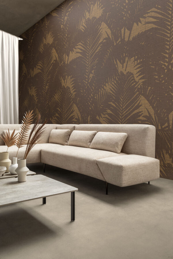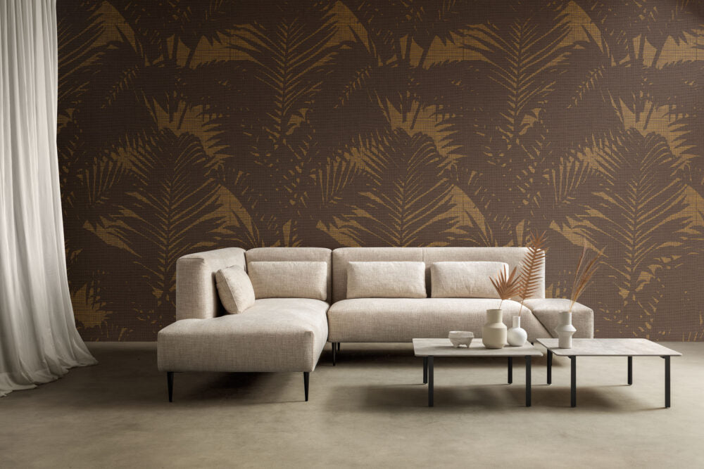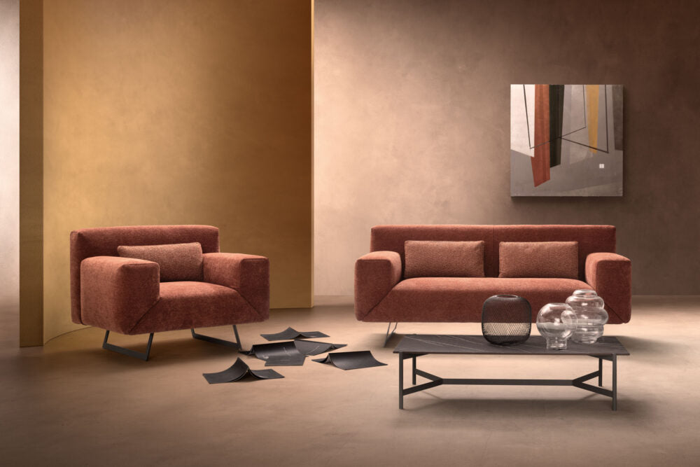 Divano dai volumi definiti. La seduta si amplia grazie alla rotazione del bracciolo, elemento che con un semplice gesto si allinea al cuscino seduta.