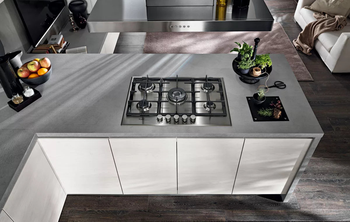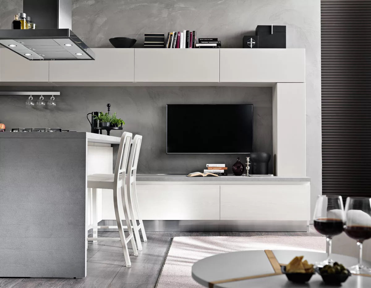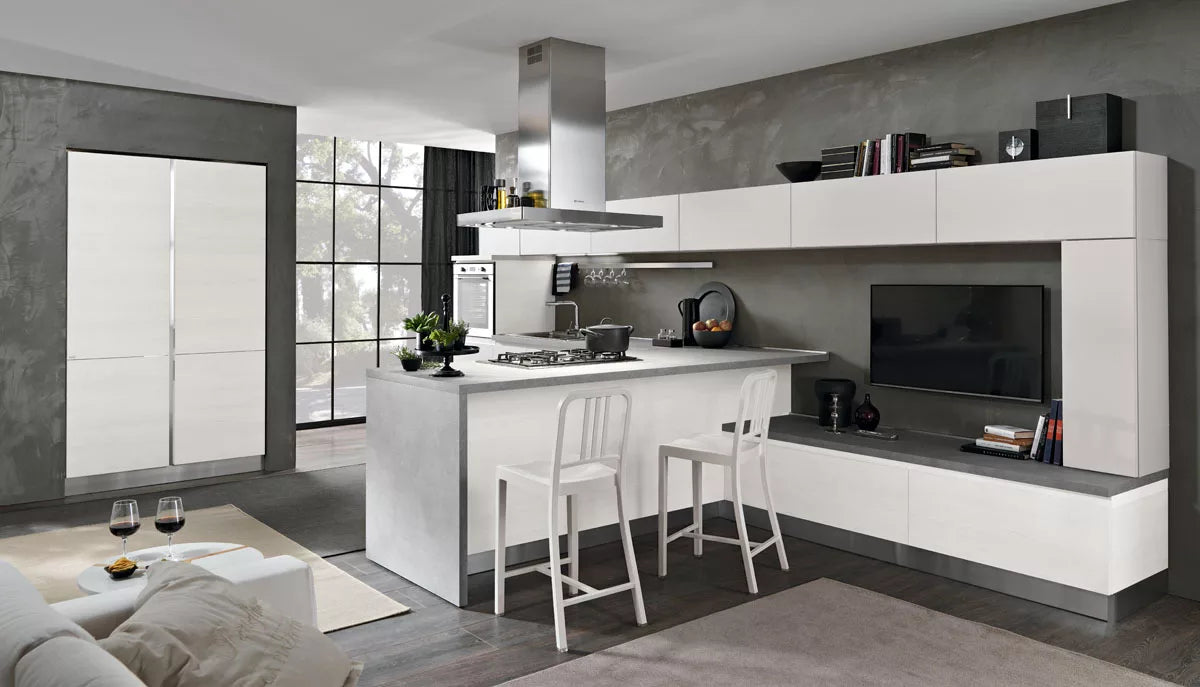 La versione Tokyo 04 è una versione del modello Tokyo dalle geometrie lineari rese ancora più eleganti dal contrasto tra olmo bianco e laccato. Questa cucina moderna dallo stile minimal è caratterizzata da una cappa in acciaio posta sopra una efficiente penisola centrale. E’ possibile notare come, nella parte alta e bassa di questa versione del modello Tokyo, gli sportelli rettangolari, raccordati da una colonna pensile in appoggio sulla destra, siano disposti in maniera equilibrata e parallela, creando praticità e armonia. La sensazione che suscita la continuità tra l’ambiente della cucina e quello del soggiorno è quella di trovarsi in un ambiente confortevole e funzionale. Ideale per openspace