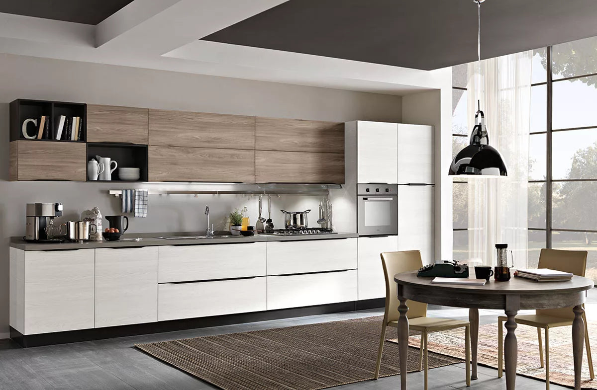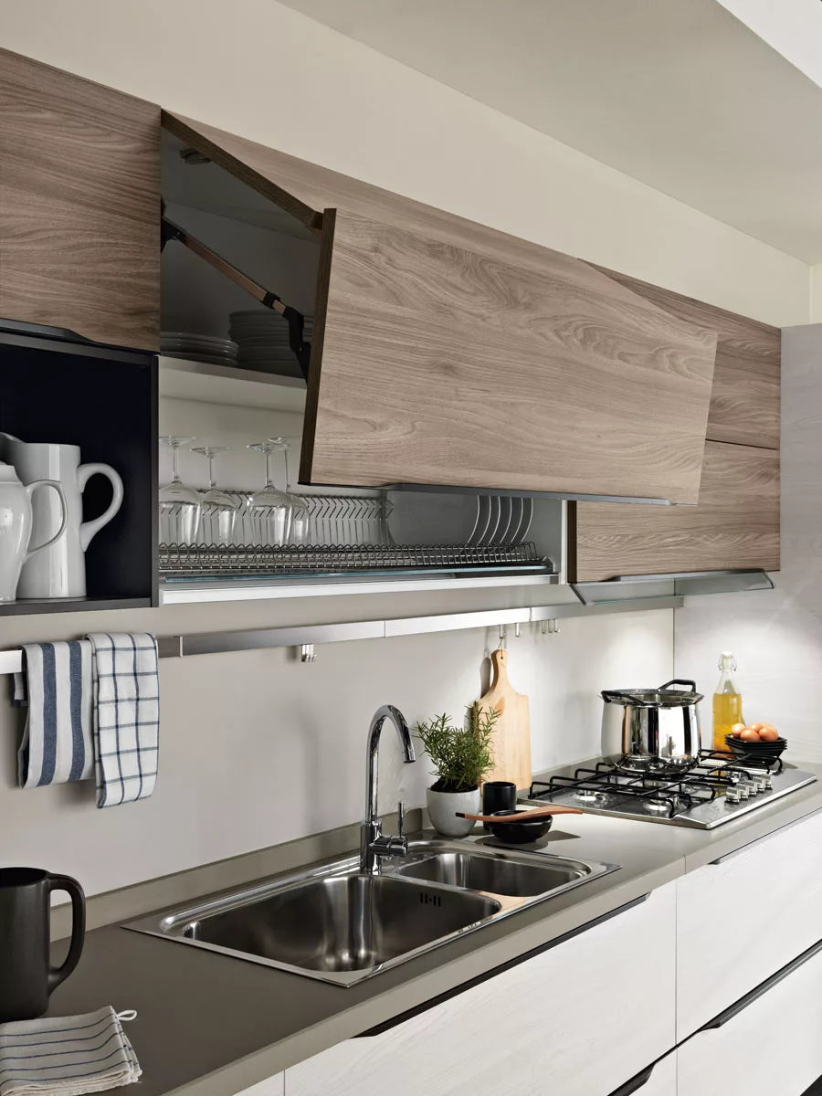 Tokyo 16 è la cucina moderna dallo stile sobrio e giovane. Essenziale nella scelta degli arredi, si presenta come un ambiente funzionale ed elegante grazie agli sportelli ad apertura verticale e le maniglie profilate in acciaio sui profili. Gli spazi a vista nella parte superiore conferiscono dinamicità alla cucina, mentre i contrasti cromatici Olmo Terra, Olmo Bianco e Cioccolato ne esaltano la leggerezza e il gusto. In pochi metri questo ambiente racchiude tutti i confort di una cucina moderna, creando uno spazio pratico che si sposa alla perfezione con le esigenze di spazio, velocità di utilizzo e pulizia.