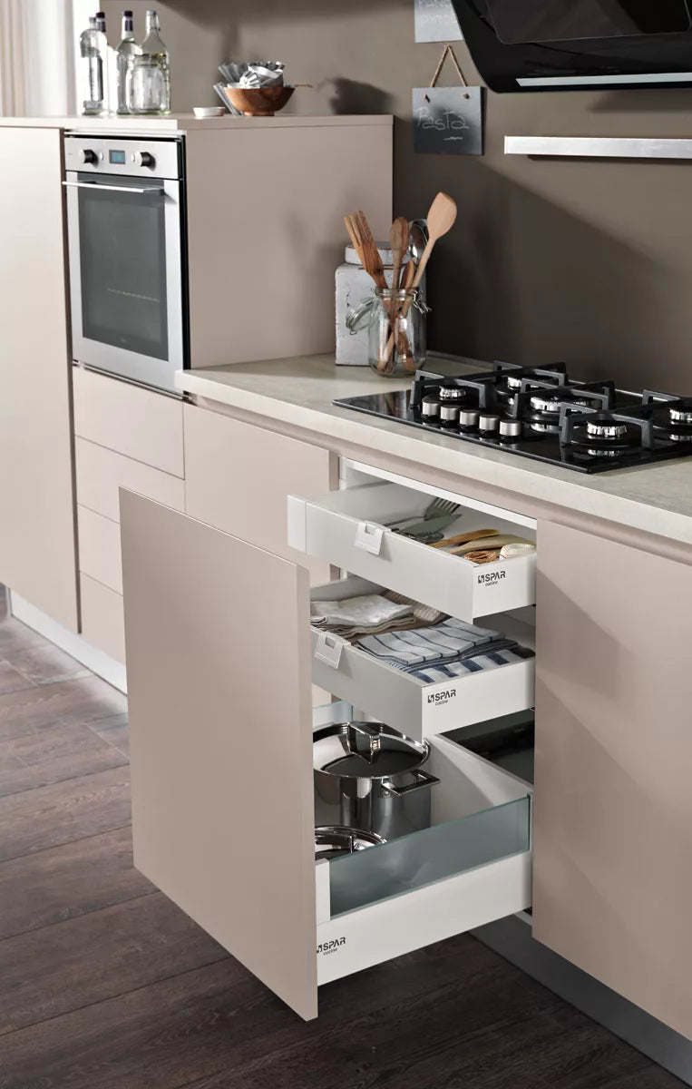 Tokyo 30 è cucina moderna, ma dall’eco tradizionale. Il contrasto degli accostamenti cromatici del cachemire, dei pensili collocati nella parte inferiore e il tocco di colore dato dai rivestimenti delle scaffalature superiori, caratterizza questa cucina dallo stile minimal. L’ambiente è alleggerito dalla parte superiore della cucina, caratterizzata dalla libreria, dagli sportelli bassi e orizzontali e dalla cappa che, con la sua linea essenziale e il tubo in acciaio le conferisce un carattere contemporaneo e all’avanguardia. La parte inferiore, di un tenue color cachemire, presenta volumi bassi dove la colonna frigo e il forno sono alla stessa altezza. La larga penisola che dona un aspetto di stabilità e fierezza, rende la cucina la stanza regina della casa, vissuta non solo dalla famiglia in privato, ma anche dagli ospiti, come spazio di convivialità.