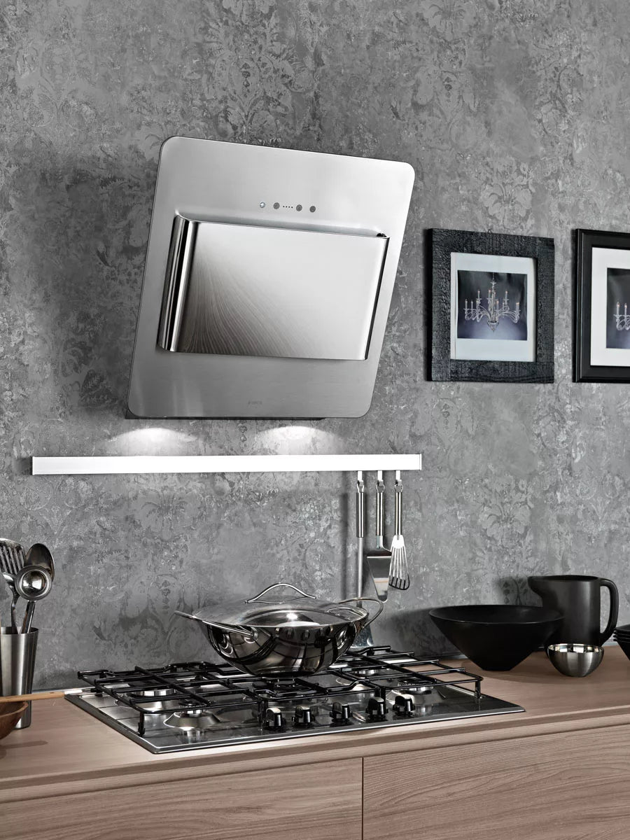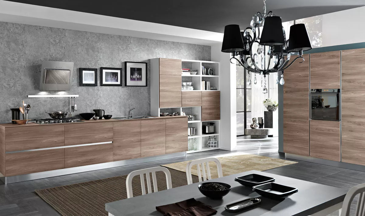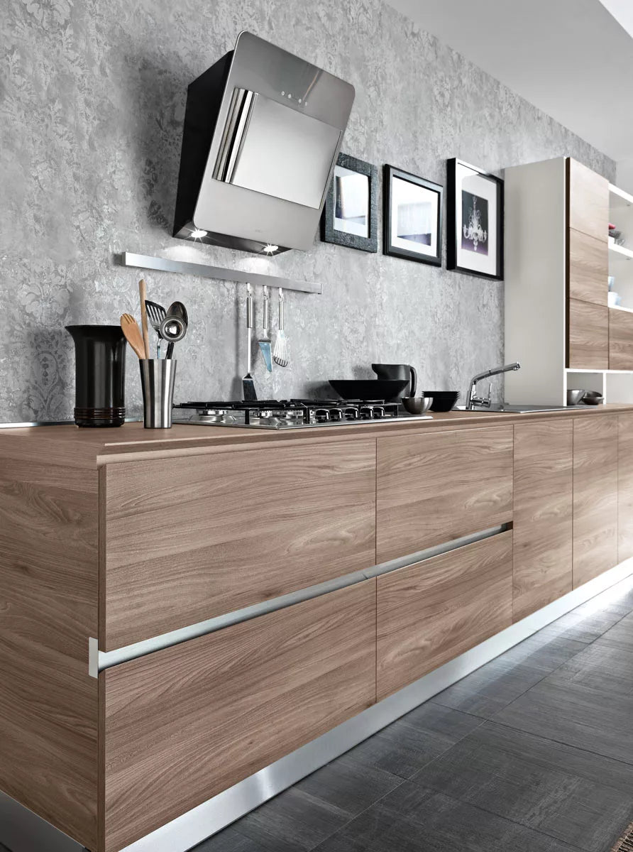 a versione Tokyo 36 è caratterizzata da un tratto minimale e pulito, reso elegante dalle maniglie in acciaio e accogliente dall’utilizzo del color Olmo Cappuccino. L’ampio spazio di appoggio si presta bene come base per semplici o elaborate lavorazioni. La cappa soprastante fissata alla parete dà un toco di attualità a questa cucina moderna, creando un effetto quasi futuristico. Gli ampi cassettoni e gli spazi che ne dividono l’omogeneità e conferiscono un perfetto connubio tra eleganza e praticità