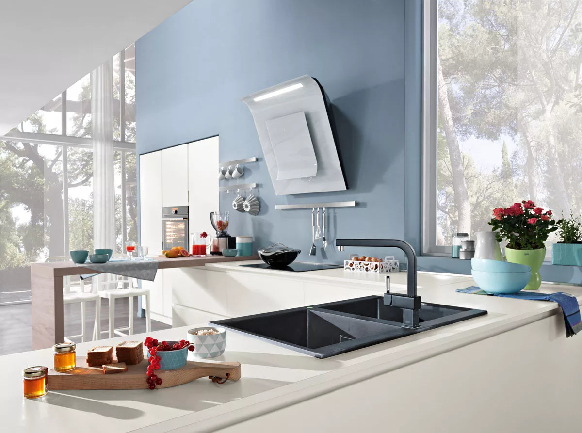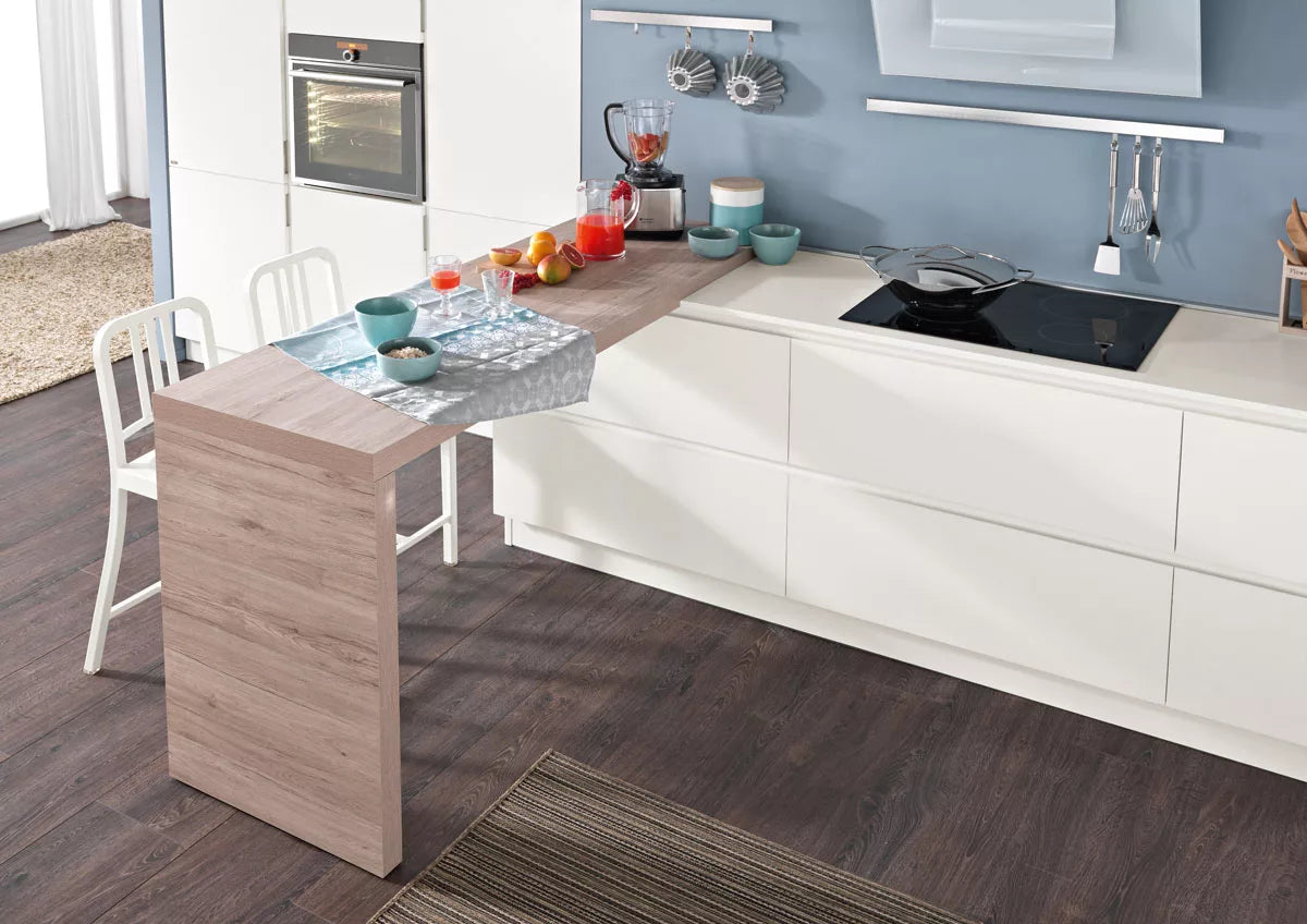 Il tratto minimale e pulito di Tokyo 44 viene esaltato dalla scelta cromatica che conferisce alle forme geometriche e lineari della cucina, note di elegante semplicità. Il bianco delle superfici viene interrotto dalla sola penisola centrale color olmo cappuccino, che sembra esprimere quasi un invito ad essere accolti verso gli altri ambienti domestici. La luce illumina ogni superficie senza incontrare ostacoli di pensili o librerie. Gli spazi dove riporre gli oggetti di uso quotidiano si dividono tra la parete incassata, al cui centro è posto il forno che trasmette il calore del focolare domestico e i cassetti bassi e lunghi posti nella parte inferiore. Il piano cottura è in vetroresina e la cappa che sporge appena un po’ dalla parete, sembra quasi un quadro contemporaneo al centro della scena. Questa cucina trasmette la purezza e l’eleganza dell’intera linea.