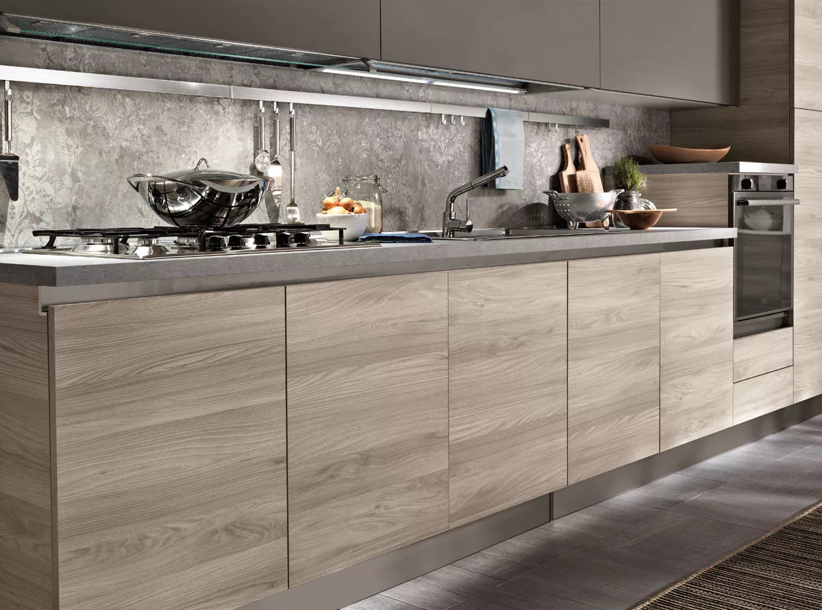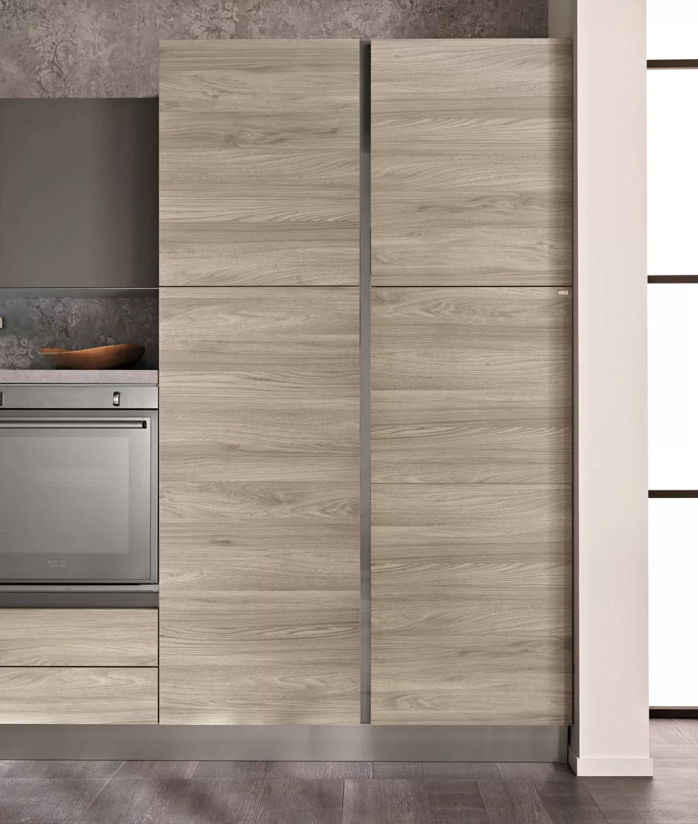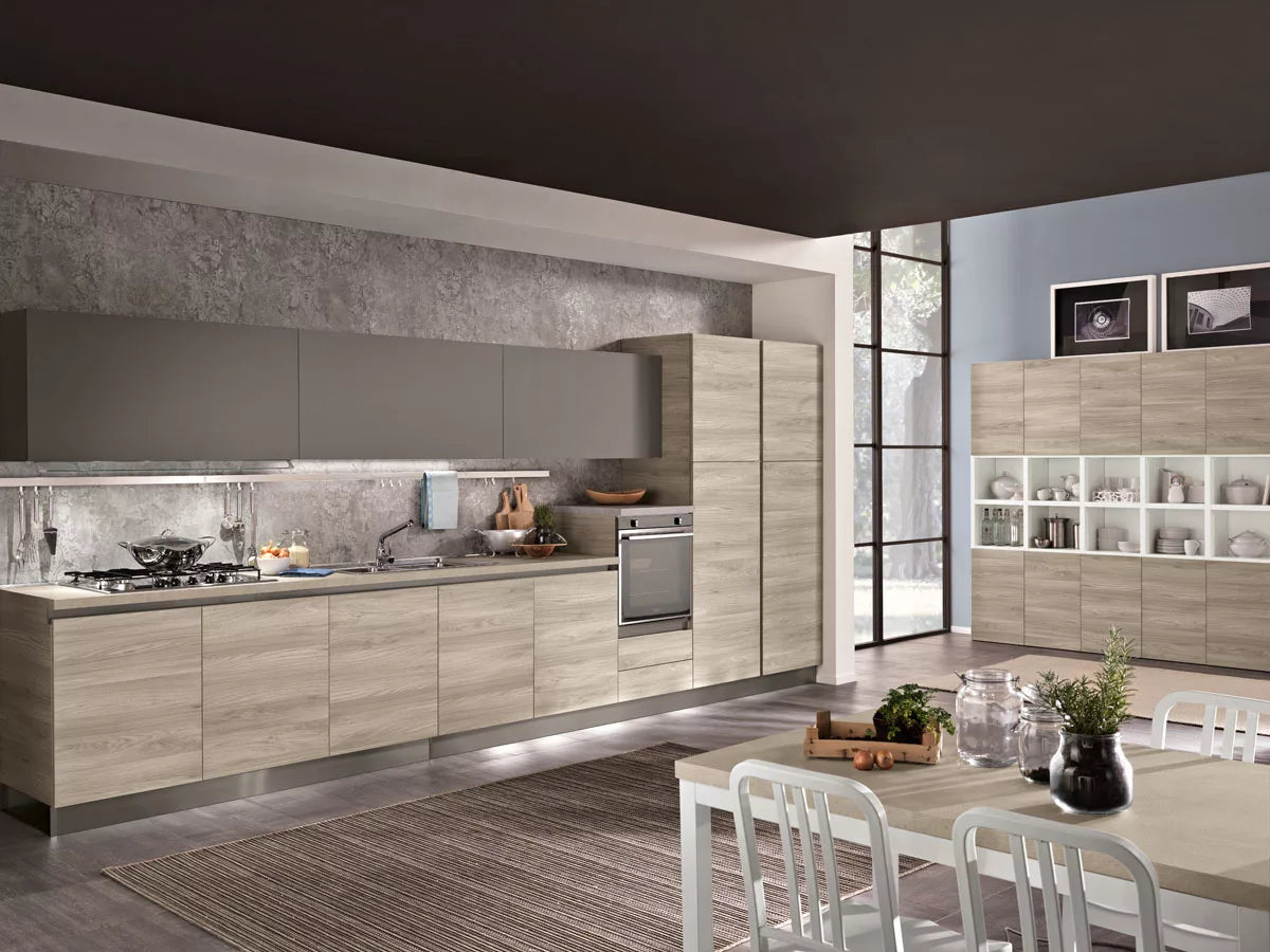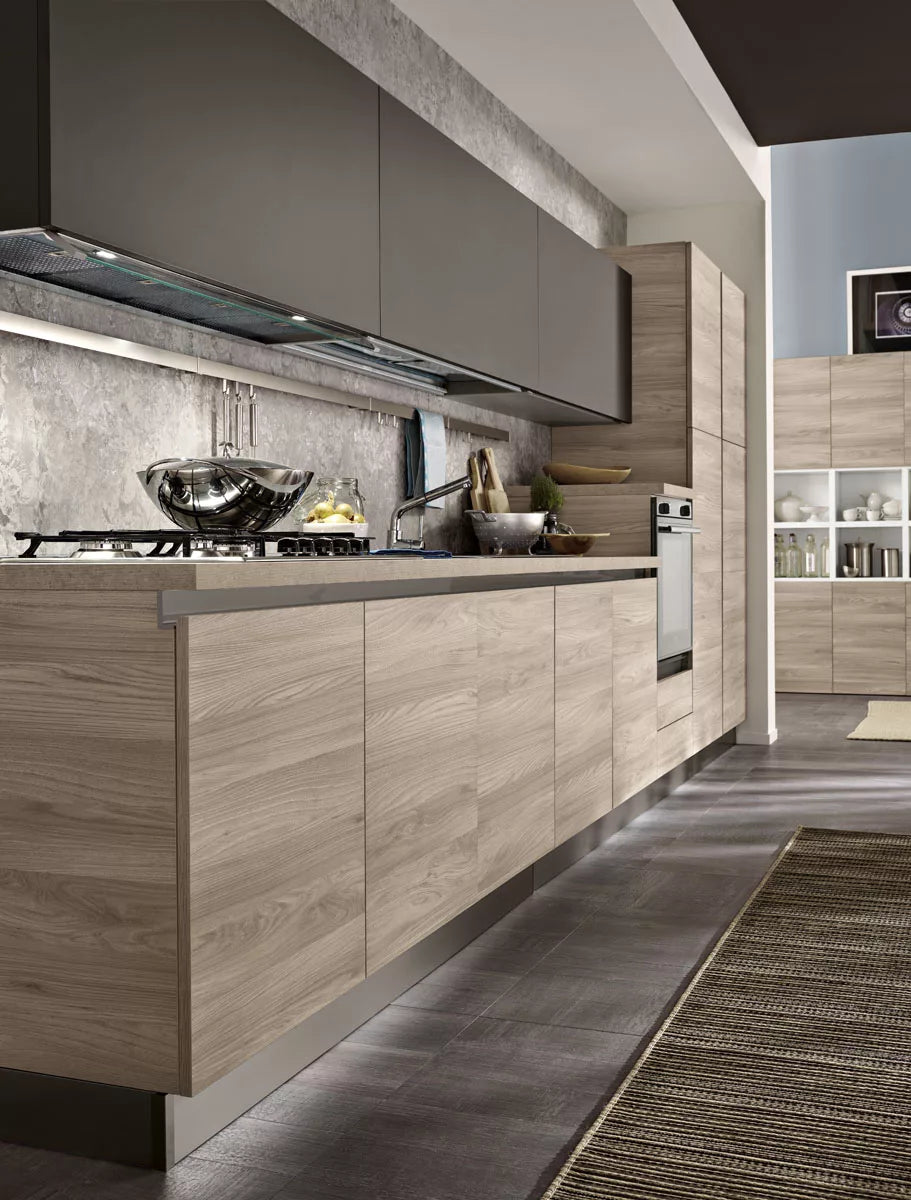 Tokyo 50 è una cucina moderna pensata per l’open space, dove lo spazio aperto ridisegna i concetti tradizionali di soggiorno e cucina, creando un ambiente in cui ogni cosa trova la sua giusta collocazione. Questa cucina spinge oltre il concetto di personalizzazione e leggerezza, giocando tra spazi pieni e vuoti. La parete composta da una doppia fila di sportelli color olmo grigio, intervallati da una doppia fila di scaffali bianchi a vista, diventa il luogo ideale da personalizzare secondo il proprio gusto. Il piano cottura, il lavello, il forno e il frigo sono disposti in maniera equidistante, donando una grande libertà di movimento e trasmettendo equilibrio e sintonia tra tutto l’ambiente. L’abbinamento del color grigio scuro degli sportelli posti sulla parte alta, delinea un perimetro che è il connubio perfetto tra uno stile minimalista e uno più familiare.