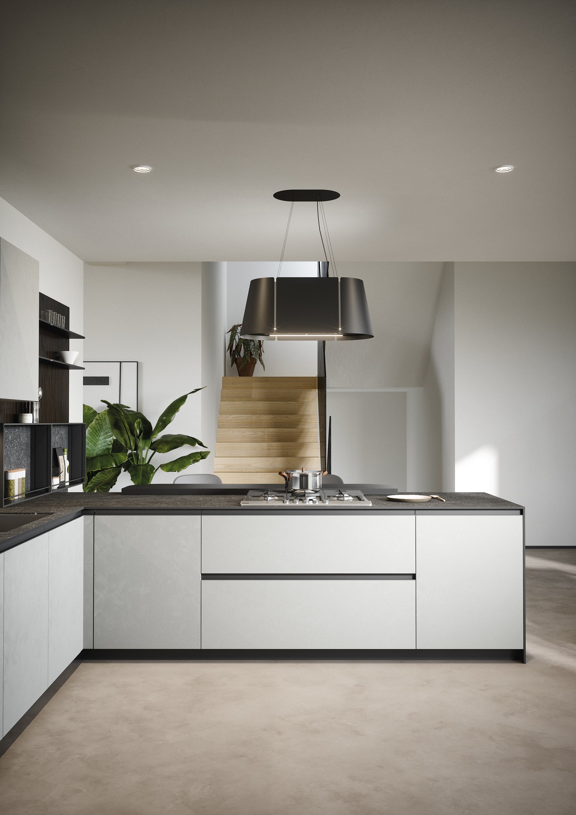 È ricercata e attuale la cucina a golfo con piano snack Vario, dalle forme arrotondate, e con penisola. Aperta sulla zona pranzo e sul salotto, ha la raffinatezza dei toni scuri della finitura rovere dark del blocco colonne, ripresa nella boiserie Ritmo, e dei top e degli schienali in robusto HPL Venezia dark. È rischiarata dal laminato resina grey, con una mano effetto materico, delle basi e dei pensili, sotto i quali è posta la barra luminosa Eos.